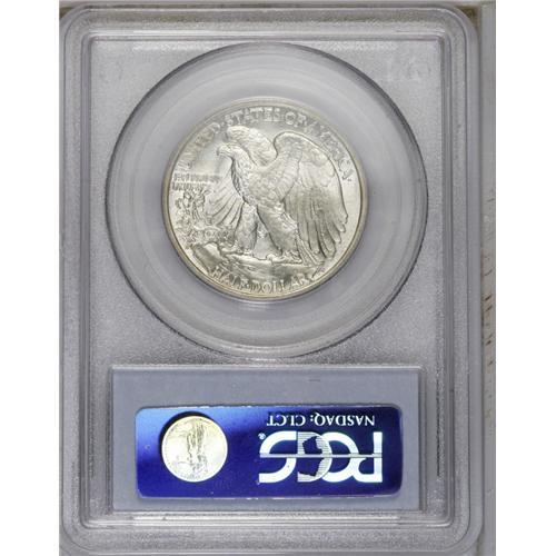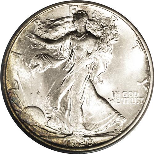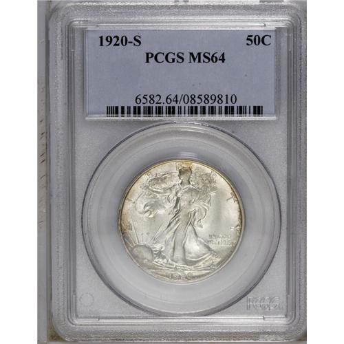 <B>1920-S<50C> MS64 PCGS.</B></I> An alluring example of this scarce issue within the Walking Liberty series, boasting silver-gray, lustrous centers that deepen near the obverse rim to amber and magenta hues. The strike through the center is soft, as usually seen on this issue, with weakness on the branch hand and the eagle's right (facing) leg. But the radiant fields are nearly pristine, and the eye appeal is quite high.