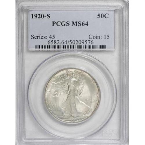 <B>1920-S 50C MS64 PCGS.</B></I> Silver-gold surfaces with a hint of smoke-gray on the obverse and lovely pastel rose and jade-green on the reverse. The strike is soft through the centers, as usual for this difficult issue, but mentionable abrasions are nonexistent, the luster is strong, and the eye appeal is high. A few darker toning spots are scattered over the reverse. PCGS has graded 47 examples finer (6/07).<BR><BR><B>Coin Engraver:</B> Adolph A. Weinman<BR><BR><b>Shipping:</b> Coins & Currency (<a target="_blank" href="http://www.heritageauctions.com/common/shipping.php">view shipping information</a>\)