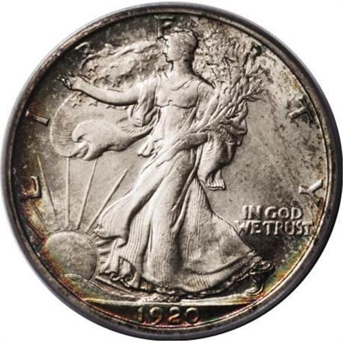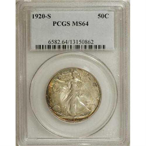 <B>1920-S 50C MS64 PCGS.</B></I> Softly struck and untoned in the centers, but highly lustrous and enhanced by attractive peripheral toning, especially on the reverse. The surfaces are nicely preserved and reveal very few marks of any kind. One of the scarcer issues among early Walkers, and one that is highly prized when located in strict Mint State. <BR><BR><B>Coin Engraver:</B> Adolph A. Weinman<BR><BR><b>Shipping:</b> Coins & Currency (<a target="_blank" href="http://www.heritageauctions.com/common/shipping.php">view shipping information</a>\)
