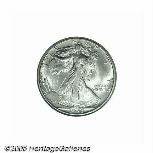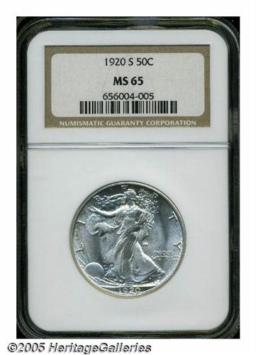 <B>1920-S<50C> MS65 NGC.</B></I> Even though a small hoard of pieces were found in 1977, these coins did not materially affect the availability of Gem, sharply struck 1920-S Walkers that are available to collectors. This is an especially notable example that displays vibrant, shimmering mint luster and above average striking characteristics. Nearly brilliant, there is just the tiniest presence of color located around 9 o'clock on the obverse.