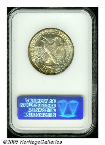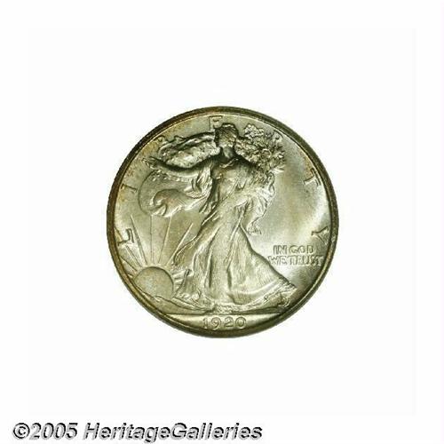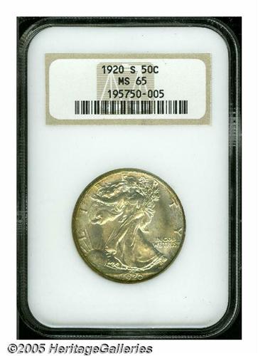 <B>1920-S<50C> MS65 NGC.</B></I> The 1920-S Walker is far more difficult to locate at the Uncirculated level than its mintage would suggest and is one of the great strike rarities in the series. Attractive golden patina embraces both sides of remarkably lustrous Gem. The surfaces, while especially clean and possessing easily enough eye appeal to warrant a Superb rating, come up just short in the category of strike and are thus limited to an MS65 rating. Population: 35 in 65, 9 finer (5/05).<BR><I>From The Stig Ericsson Collection.</B></I>