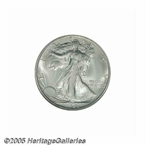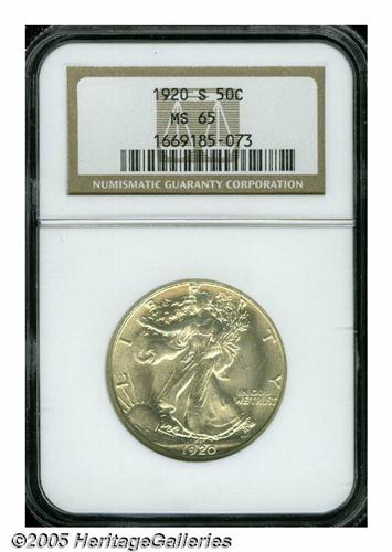 <B>1920-S<50C> MS65 NGC.</B></I> This is a relatively high mintage date, with some 4,624,000 pieces struck, yet it is elusive in Gem quality. Due to a substantially higher mintage, the actual rarity of this issue in Gem quality is often overlooked. Although not fully struck, this is a lovely example of the issue. Liberty's head, hand, and skirt lines are all less than fully defined, like the eagle's upper leg details on the reverse. Heavy die polishing lines in the right obverse field impart a satiny appearance. The surfaces are fully brilliant with just the faintest champagne toning. Population: 35 in 65, 9 finer (6/05).<BR><I>From The Robert Moreno Collection.</B></I>