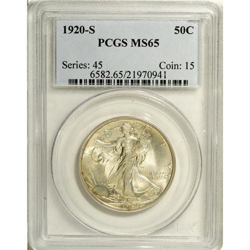 <B>1920-S 50C MS65 PCGS.</B></I> The strike on this example is somewhat above average for the issue; Liberty's head is fairly sharp, as are most of the gown lines, and the thumb is partially defined. Vibrant luster exudes from bright silver surfaces, and whispers of gold-brown color make occasional visits to the border areas. Population: 44 in 65, 4 finer (12/06).<BR><BR><b>Shipping:</b> Coin/Currency (<a target="_blank" href="http://www.heritageauctions.com/common/shipping.php">view shipping information</a>)