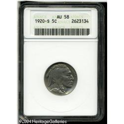 1920-S 5C AU58 ANACS. Showing traces of rub on the <B>1920-S 5C AU58 ANACS.</B></I> Showing traces of rub on the high point of the Indian's cheek and bison's head, this Buffalo nickel displays flashy luster and an attractive low intensity multi-colored patina. <BR><BR><B>Important notice:</B> Heritage usually auctions material at the rate of 200-250 lots per hour. On some occasions eBay Live bid software or the Internet may not be able to keep up with the pace of the auction. We recommend placing a realistic absentee bid now as insurance to avoid disappointment. Occasionally the auctioneer may eliminate or reject an eBay Live bid, and the auctioneer may also reopen a lot after the close of the eBay live bidding (usually because we missed an audience bid), and may reject your bid even if it shows you as the winning bidder. By bidding via eBay Live, you agree that Heritage may award the lot to another bidder at its sole discretion under the circumstances described above or any other reasonable circumstances. Since eBay bids are not shown to us until we open the lot on the floor, we treat those bids just like floor bids. In most cases the floor responds before the eBay bid is presented to us, due to Internet lag time, so for consistency we have made it a policy that floor bids are always considered first over tie eBay live bids. Also please note that all Heritage lots purchased through eBay Live carry a 20% Buyer's Premium. Please make sure you read the Terms and Conditions before you bid. This lot is being auctioned in conjunction with a live floor auction by Heritage Galleries & Auctioneers. All final auction and invoice information will be supplied by Heritage Galleries & Auctioneers, and all other information should be considered preliminary. Lot:5585