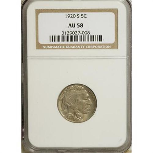 <B>1920-S 5C AU58 NGC.</B></I> NGC Census: (59/325). PCGS Population (73/448). Mintage: 9,689,000. Numismedia Wsl. Price for NGC/PCGS coin in AU58: $300. (#3946)<BR><BR><B>Coin Engraver:</B> James E. Fraser<BR><BR><b>Shipping:</b> Coins & Currency (<a target="_blank" href="http://www.heritageauctions.com/common/shipping.php">view shipping information</a>)