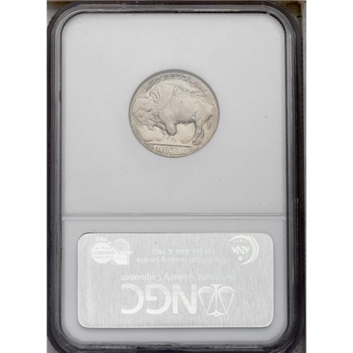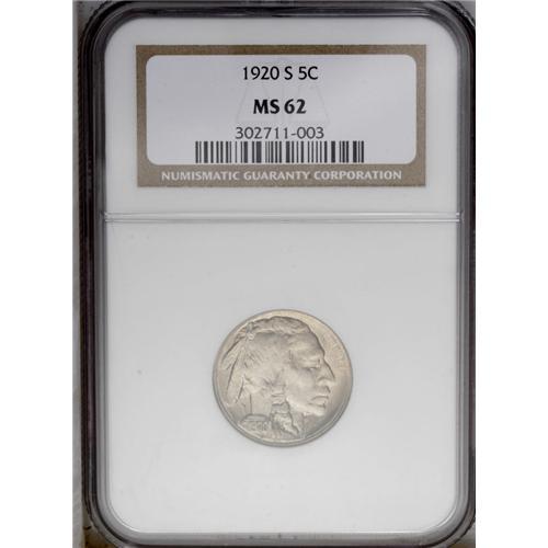 <B>1920-S<5C> MS62 NGC.</B></I> The mushy strike is particularly noticeable on the reverse, and die clash marks are seen in the lower obverse fields. A conditionally scarce offering, this coin presents a nearly uniform silver-gray appearance with hints of olive patina over both sides. A heavy die crack lies across the top of the bison's head, and a wispy lintmark (as struck) is noted at the top of his shoulder. Neither side reveals any post-strike distractions. One of the great condition rarities in the Buffalo nickel series. Although nearly 10 million pieces were minted, the vast majority were spent and spent again, leaving only a small quantity of Uncirculated pieces.