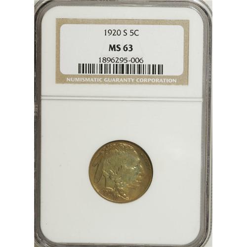 <B>1920-S 5C MS63 NGC.</B></I> Attractive toning in shades of orange-gold, fuchsia, and sage grace each side of this pretty coin. The grade is likely held back by the somewhat diminished luster, but the strike is better than expected on this semikey coin, and other distractions are nil.<BR><BR><b>Shipping:</b> Coins & Currency (<a target="_blank" href="http://www.heritageauctions.com/common/shipping.php">view shipping information</a>)