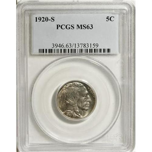 <B>1920-S 5C MS63 PCGS.</B></I> This issue of under 10 million pieces has its roots in the depression that affected the American economy immediately after the Great War. The uncommonly lustrous Select piece offered here is lightly abraded with delicate blue and gold tints over each side. Solidly struck and pleasing.<BR><BR><B>Coin Engraver:</B> James E. Fraser<BR><BR><b>Shipping:</b> Coins & Currency (<a target="_blank" href="http://www.heritageauctions.com/common/shipping.php">view shipping information</a>)