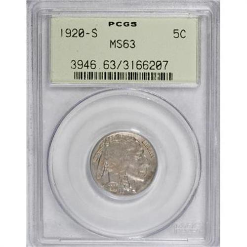 <B>1920-S 5C MS63 PCGS.</B></I> Lovely honey-gold patina graces this satiny and unmarked better date nickel. The hair near the braid is indistinct, but the remainder of the designs are crisp. Minor reverse carbon determines the grade. In an old green label holder.<BR><BR><B>Coin Engraver:</B> James E. Fraser<BR><BR><b>Shipping:</b> Coins & Currency (<a target="_blank" href="http://www.heritageauctions.com/common/shipping.php">view shipping information</a>)
