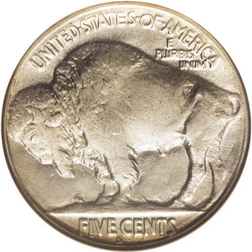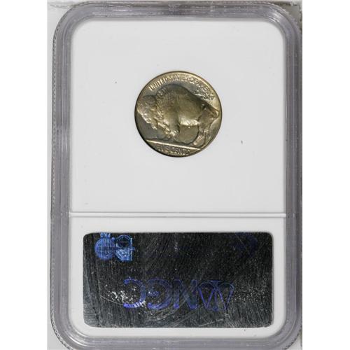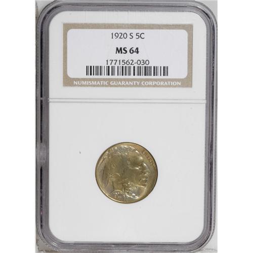 <B>1920-S<5C> MS64 NGC.</B></I> David Lange, in his <I>The Complete Guide to Buffalo Nickels,</B></I> calls this date in Mint State "among the scarcest coins in the series." The present near-Gem specimen has beautiful deep greenish-gold patination that evenly coats both sides. The strike is somewhat weak on the Indian's braid and the highpoints of the buffalo, but the overall eye appeal is quite high. NGC has graded only five coins finer (7/06).