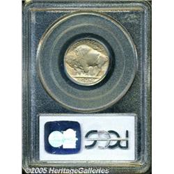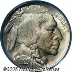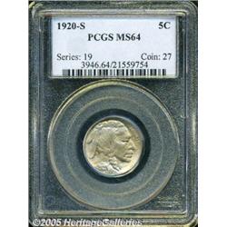 <B>1920-S 5C MS64 PCGS.</B></I> The '20-S is one of the most highly respected strike rarities in the Buffalo Nickel series, a quality that eliminates nearly all hopefuls from attaining Gem status. This piece is a bit mushy on the highpoints of the reverse as should be expected, but its deep, satiny luster and golden-gray overtones give it a most pleasing appearance.
