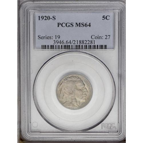 <B>1920-S<5C> MS64 PCGS.</B></I> The shimmering rose-gray surfaces, while not completely struck up (very few are), are exceptionally clean and frosty, being clearly suggestive of a higher grade. Myriad microscopic carbon flecks are noted over each side, but are visible with light magnification. Very scarce in the better grades of Uncirculated, especially when one considers its mintage of nearly 10 million pieces.