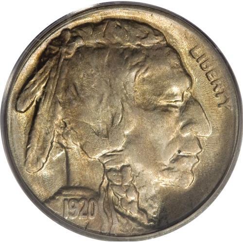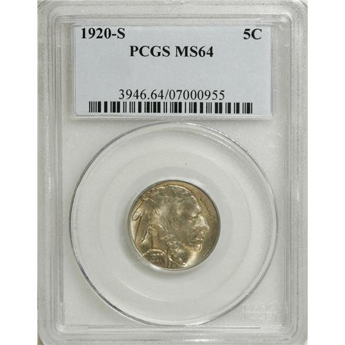 <B>1920-S 5C MS64 PCGS.</B></I> The strike is fairly soft on both sides, with LIBERTY quite weak at the letter tops and little detail above the knot in the Indian's braid. The reverse shows the usual weakness on the bison's shoulder and tail. Silver-gold streaky luster is seen on each side. PCGS has only certified 17 pieces finer than this Choice Mint State example (4/07).<BR><BR><b>Shipping:</b> Coins & Currency (<a target="_blank" href="http://www.heritageauctions.com/common/shipping.php">view shipping information</a>)