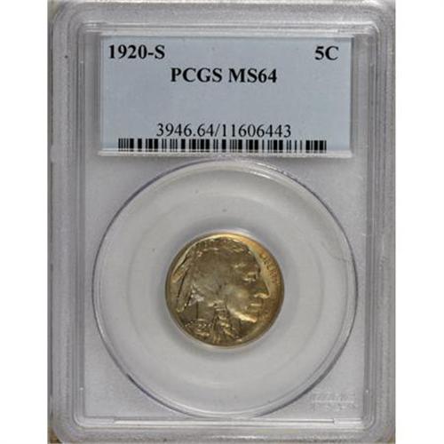 <B>1920-S 5C MS64 PCGS.</B></I> Attractively toned in honey-gold, rose, and aquamarine. This lustrous better date nickel is essentially unabraded, and mintmark is needle-sharp. The centers and the tail are also crisp. The obverse border has an orange peel texture, as struck from a long-in-use die.<BR><BR><B>Coin Engraver:</B> James E. Fraser<BR><BR><b>Shipping:</b> Coins & Currency (<a target="_blank" href="http://www.heritageauctions.com/common/shipping.php">view shipping information</a>)