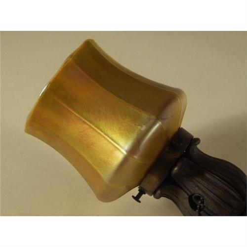 BANNISTER LIGHT: A 1920's bronze tone cast metal bannister light, L-shape arm with cone finial, iridescent gold Quezel glass shade (as seen), untested, 14'' x 7''.