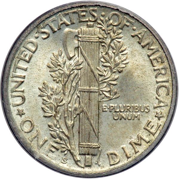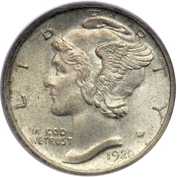 1920-S Mercury Dime. PCGS graded MS-64 Full Bands PQ. Boldly struck. Evenly toned. Needs to be dipped and probably would grade MS65FB. The Denver Mint Mercury dimes are most difficult to find with full bands. This specimen, unlike others in its period, received a full strong blow by the coining dies, which impressed all the finer details onto the coin in microscopie detail. Pop 87; 35 finer, 25 in 65, 7 in 66, 3 in 67 (PCGS # 4933) .