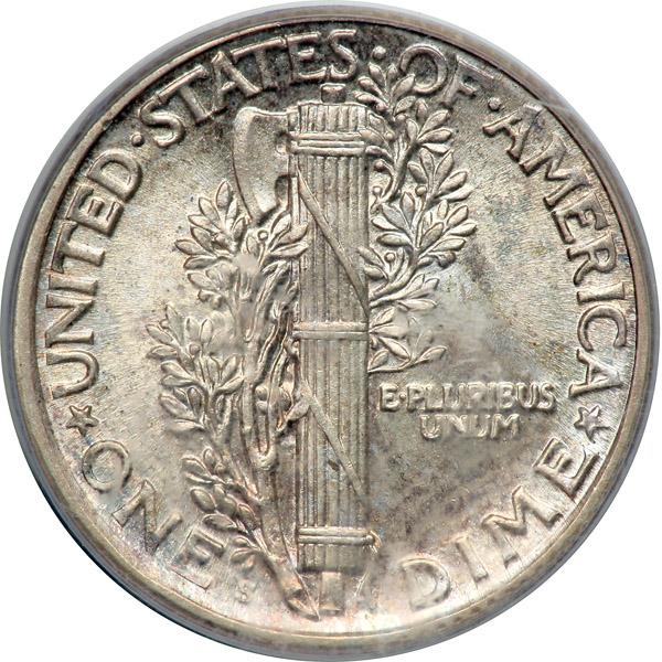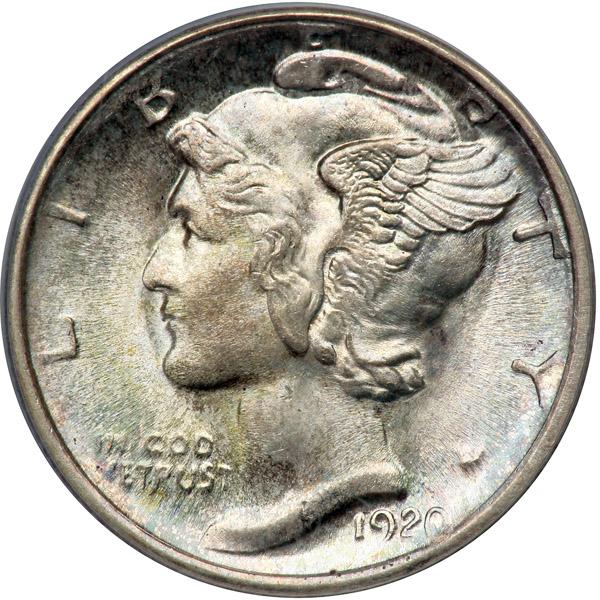 1920-S Mercury Dime. PCGS graded MS-65 Full Bands. A brilliant lusterous gem with just a hint of delicate pastel toning. While widely available in lower grades, high grade examples of the 1920-S are very elusive; in fact, they are one of the more coveted S-mint dates in the series in Gem Full Bands condition. The surfaces on this piece show the vibrancy of original frosted mint luster San Francisco issues are famous for. Additionally, each side has a delicate overlay of toning. Boldly defined throughout with no offending marks. Pop 25; 10 finer with 7 in 66, 3 in 67 (PCGS # 4933) .