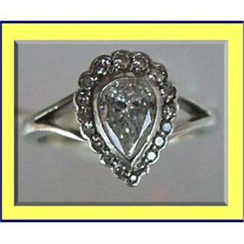 Estate diamond ring. 93-year-old seller dates it to 1920's. May be slightly later. <BR>American size 6 1/2.<BR>Center stone is beautiful pear shape. Without being an expert, you can see there are no inclusions and it is a good colour. Approx size 40 pts. Surrounded by approx 20 1pt diamonds. <BR>Set in 14K white gold.<BR>Good condition.
