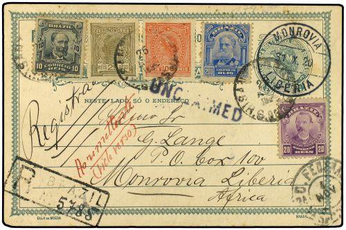 1920 SANTA CRUZ a MONROVIA (Liberia). Entero Postal circulado por correo certificado con franqueo adicional de 10, 20, 25, 100 y 200 reis. Espectacular franqueo y muy rara destinación.