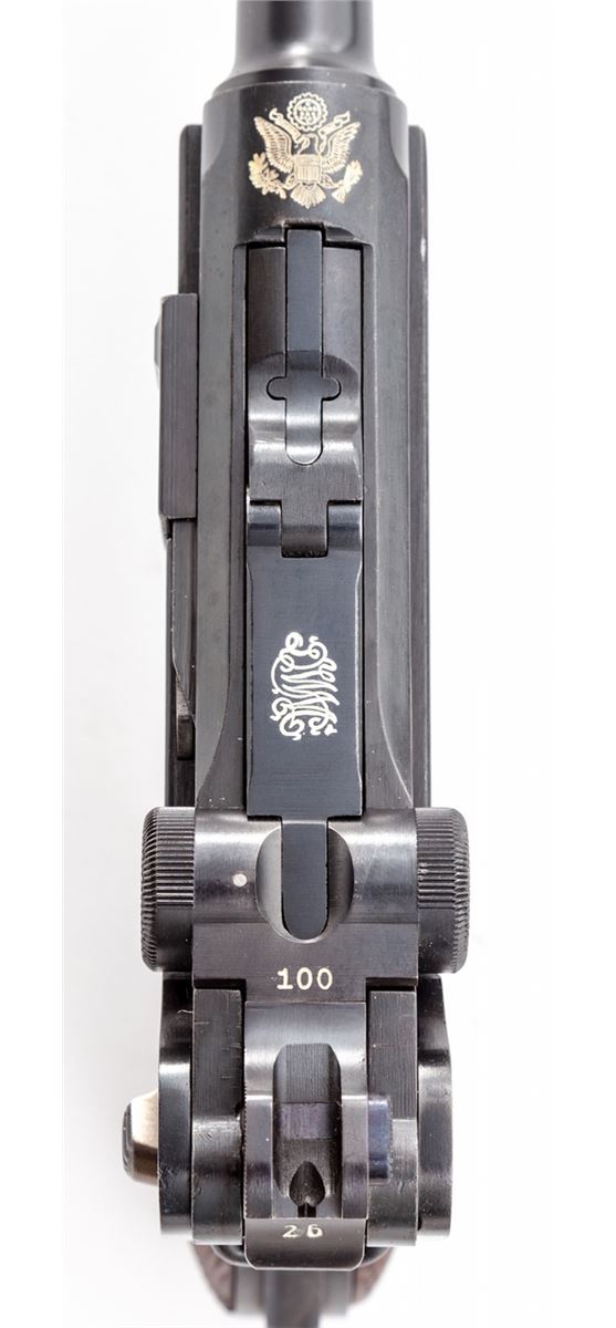 1920 Stoeger 3-Line American Eagle Navy Luger, #426v, 9mm, 6'' barrel, blue finish with straw small parts, factory checkered walnut grips, and one tin-plated magazine with circle cut walnut based marked ''CAL 9M/M''. American eagle to chamber area, DWM to central toggle link, two-position rear sight, ''Safe'' marked thumb safety, ''Loaded'' marked extractor; ''(crown)/N'' and ''U'' proofmarks. Right side of receiver marked ''Germany-A.F. Stoeger Inc/New York./Genuine Luger-Registered U.S. Patent Office.'' Condition is excellent retaining approx. 98% original blue with wear at muzzle, forward and high edges. Crisp grips and action, bright bore. Est.: $6,000-$8,000. (C&R/PPT) (John Siroonian estate)