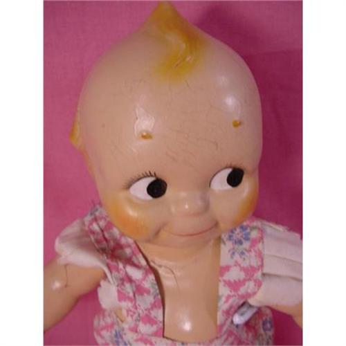 1920 Vintage Rose O' Neill Compo Kewpie, Good Condition, Original Outfit. 13inches tall and jointed, all composition. He has googlie eyes, topknot, and impish smile. He wears his original sunsuit in pink and blue cotton print. He is in good condition but shows some cracking in the compo. Still a great addition to your vintage doll collection!