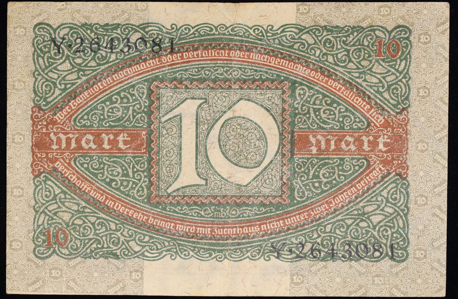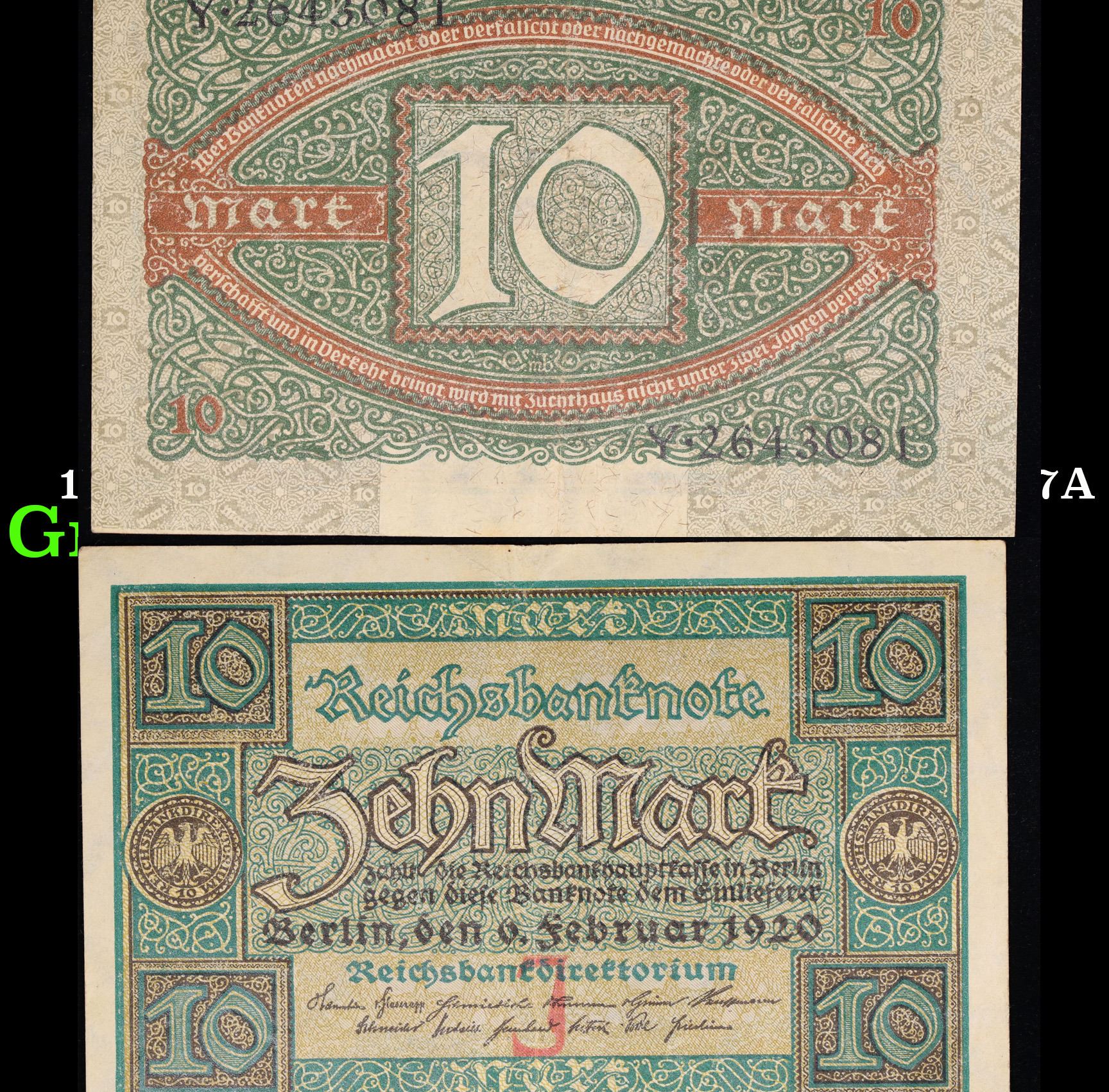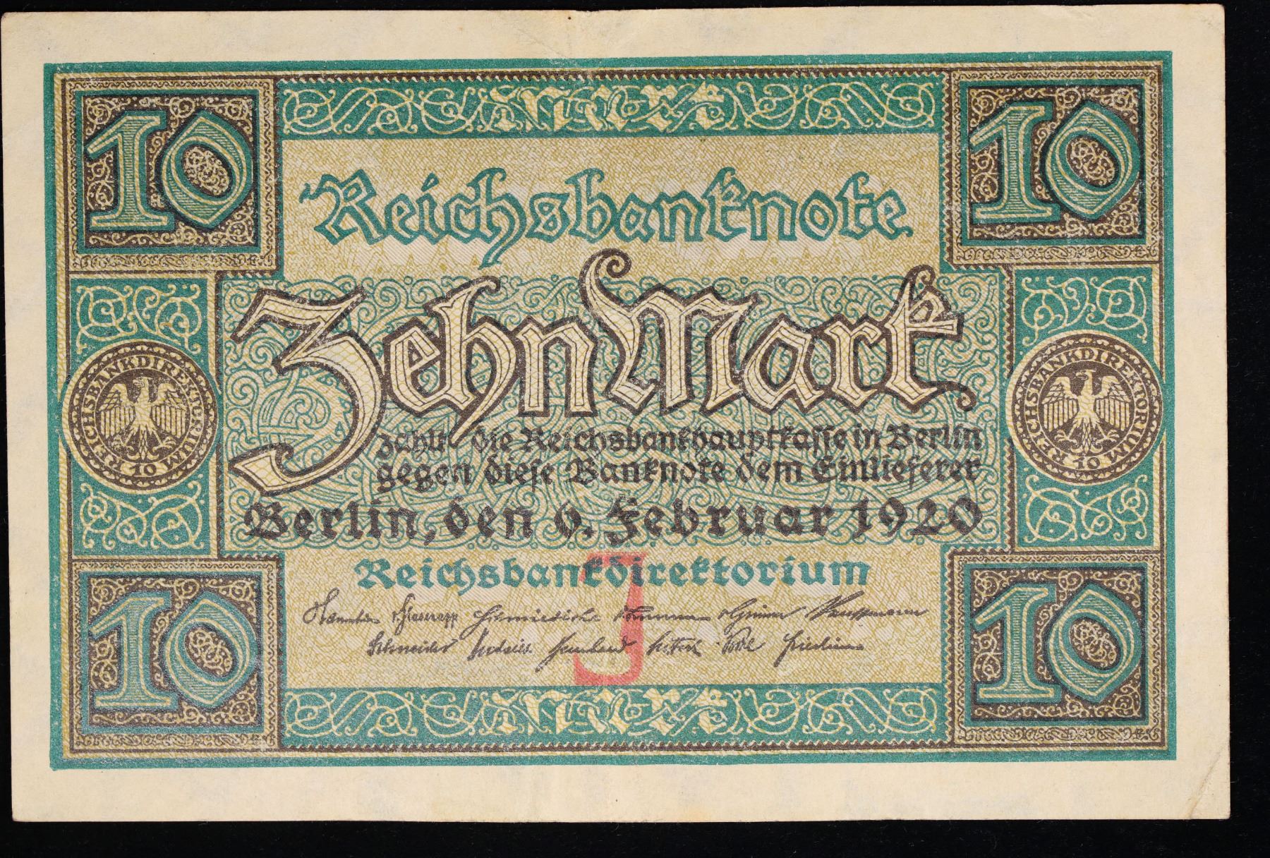 1920 Weimar Germany 10 Mark Note P# 67A Grades Select AU. In the early 1920s, post-WWI Germany saw its economy spiraling out of control. Hyperinflation started directly after the war in 1918, but truly took over the Weimar Republic from 1921 to 1923. The value of the Mark declined incredibly rapidly. 1 USD was equal to 50 German Marks at the beginning of 1920. Toward the end of 1923, 1 USD was equal to over 4,200,000,000,000 German Marks. At times, denominations of the Mark became less valuable than the paper and labor to print it almost immediately after printing. Thus, denominations of the Mark notes became incredibly large, ending up in the tens of trillions.