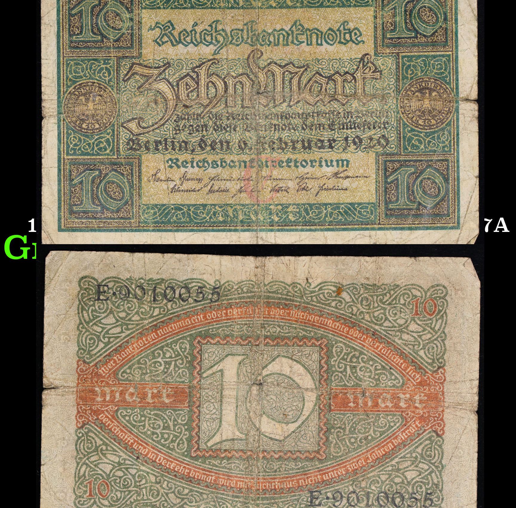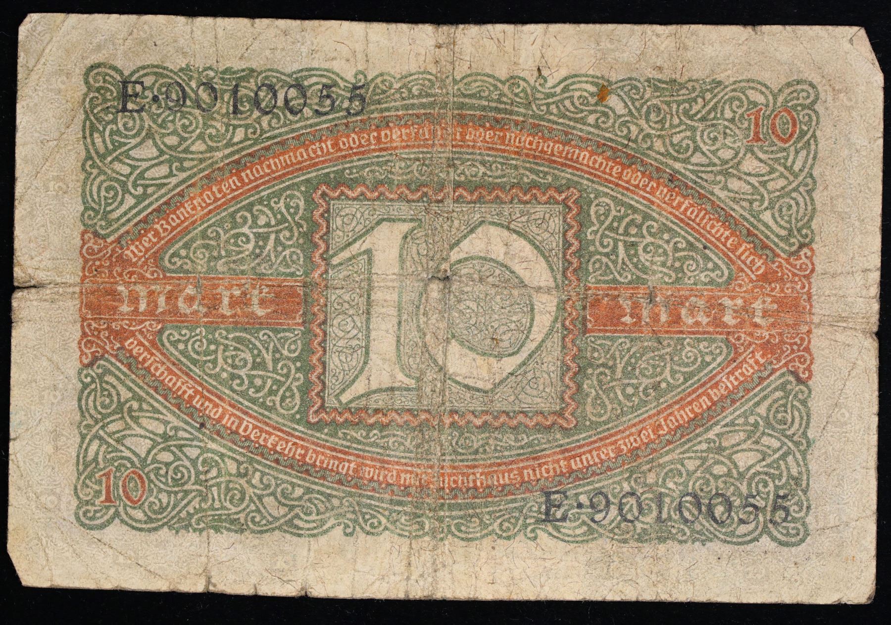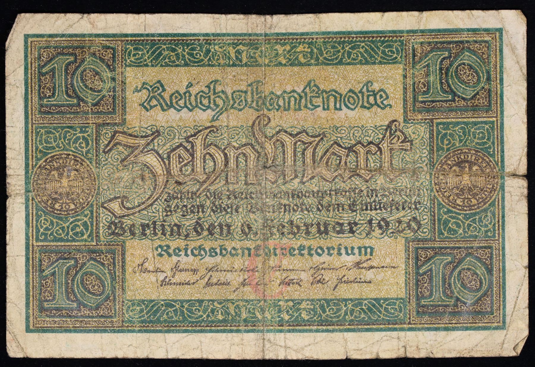 1920 Weimar Germany 10 Mark Note P# 67A Grades f+. In the early 1920s, post-WWI Germany saw its economy spiraling out of control. Hyperinflation started directly after the war in 1918, but truly took over the Weimar Republic from 1921 to 1923. The value of the Mark declined incredibly rapidly. 1 USD was equal to 50 German Marks at the beginning of 1920. Toward the end of 1923, 1 USD was equal to over 4,200,000,000,000 German Marks. At times, denominations of the Mark became less valuable than the paper and labor to print it almost immediately after printing. Thus, denominations of the Mark notes became incredibly large, ending up in the tens of trillions.