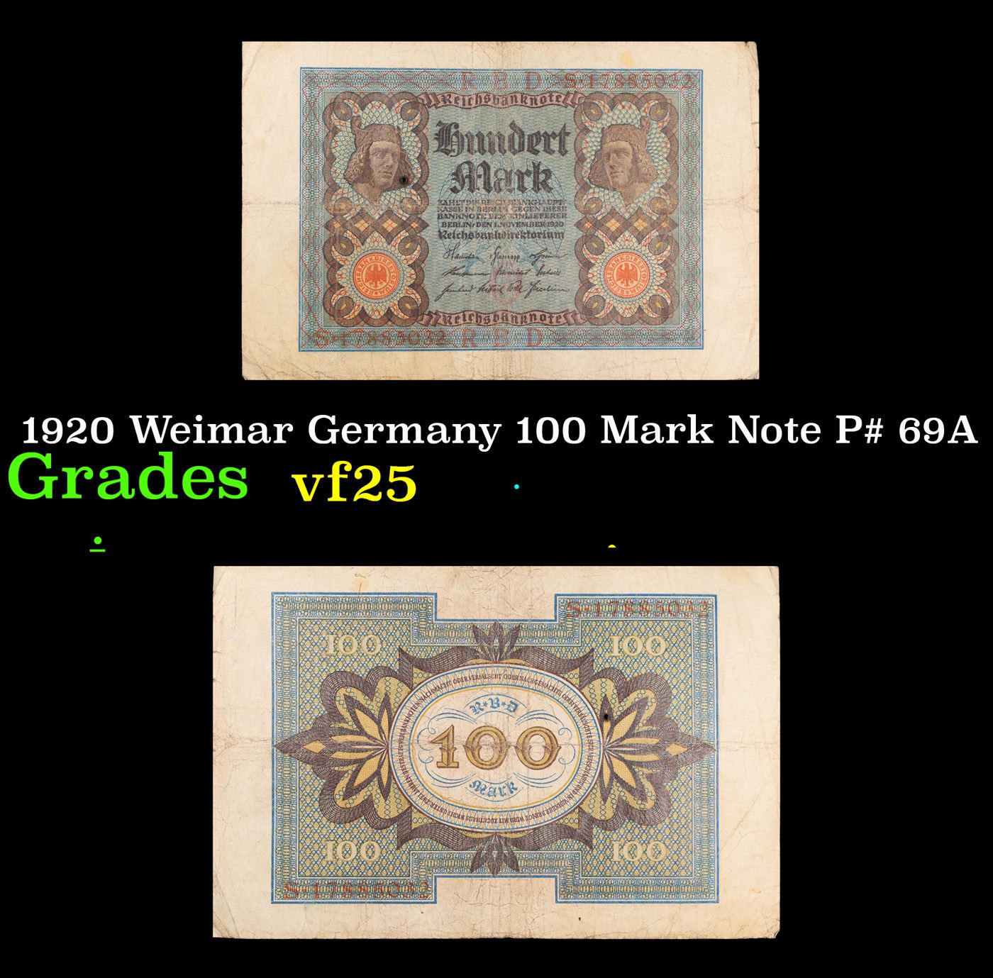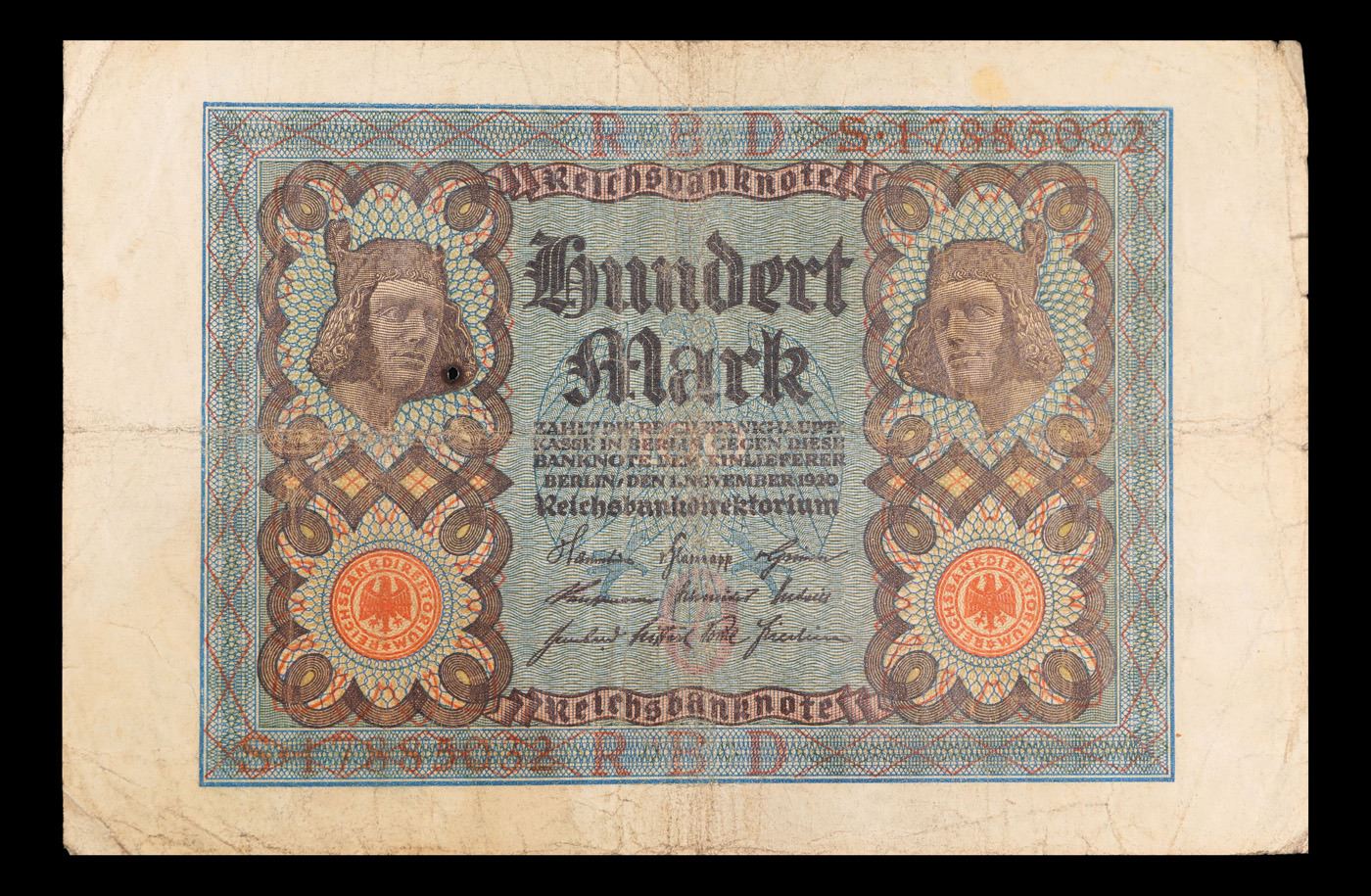 1920 Weimar Germany 100 Mark Note P# 69A Grades vf+. In the early 1920s, post-WWI Germany saw its economy spiraling out of control. Hyperinflation started directly after the war in 1918, but truly took over the Weimar Republic from 1921 to 1923. The value of the Mark declined incredibly rapidly. 1 USD was equal to 50 German Marks at the beginning of 1920. Toward the end of 1923, 1 USD was equal to over 4,200,000,000,000 German Marks. At times, denominations of the Mark became less valuable than the paper and labor to print it almost immediately after printing. Thus, denominations of the Mark notes became incredibly large, ending up in the tens of trillions.