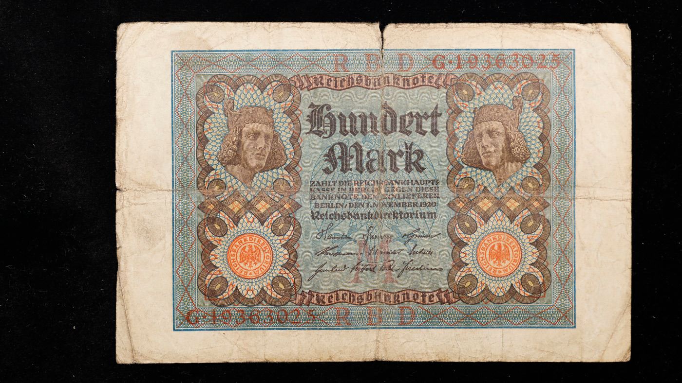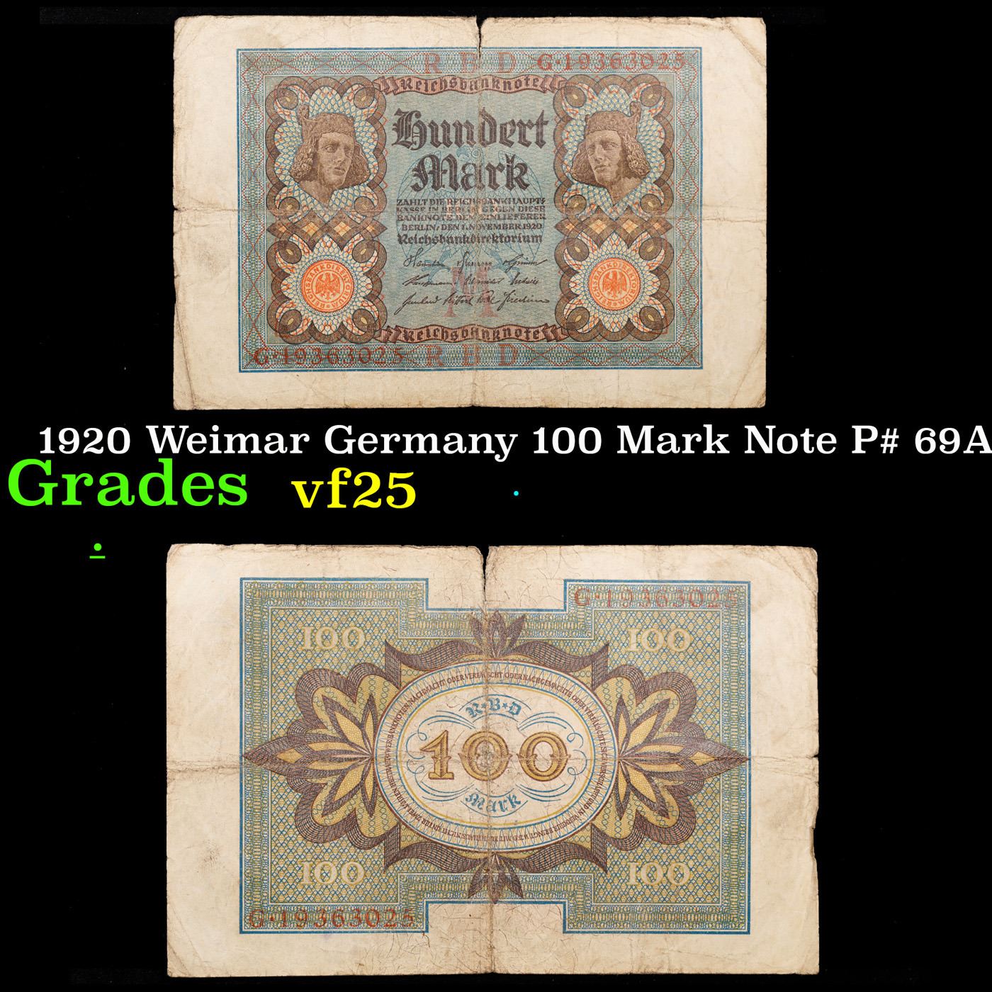 1920 Weimar Germany 100 Mark Note P# 69A Grades vf+. Notgeld is German for "emergency/necessity money". Notgeld typically refers to German and Austrian notes produced in the post-WWI period. Somewhat similar to Depression Scrip in the USA, these notes were issued when there wasn'te nough state-produced money available from the central bank. Issuing institutions were often a town's savings banks, municipalities, or private or state-owned firms. Nearly all issues contained an expiry date, after which time they were invalid. Issues without dates ordinarily had an expiry announced in a newspaper or at the place of issuance.