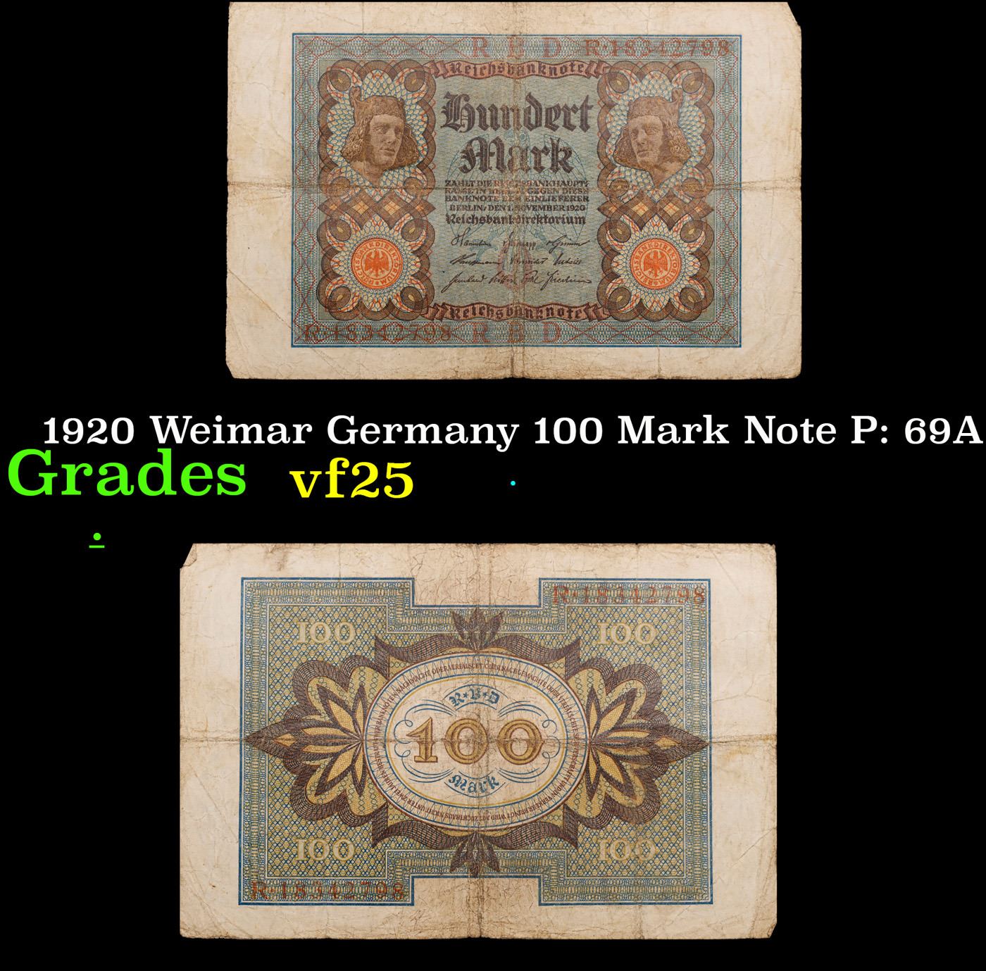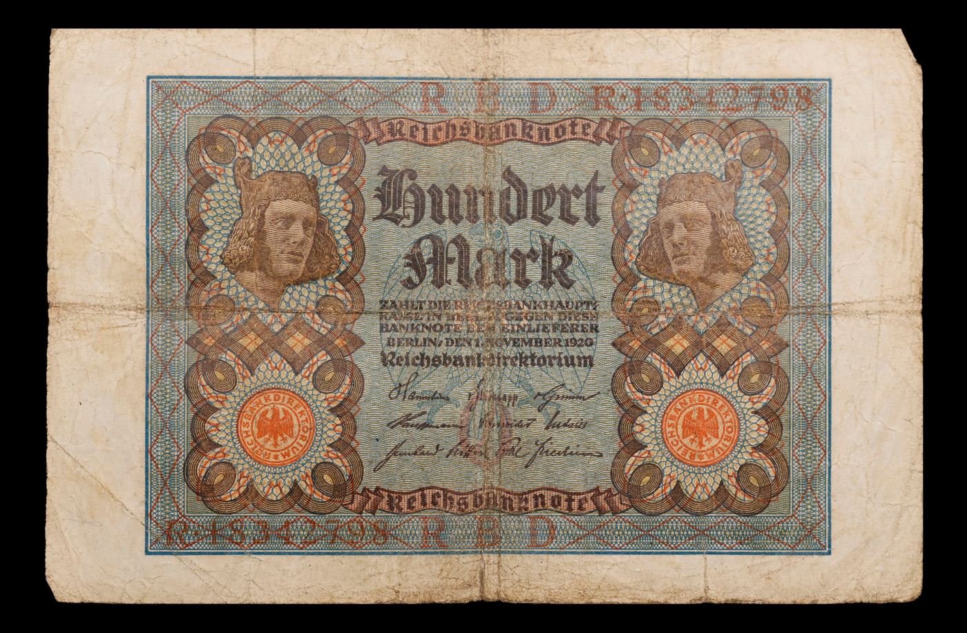 1920 Weimar Germany 100 Mark Note P: 69A Grades vf+. In the early 1920s, post-WWI Germany saw its economy spiraling out of control. Hyperinflation started directly after the war in 1918, but truly took over the Weimar Republic from 1921 to 1923. The value of the Mark declined incredibly rapidly. 1 USD was equal to 50 German Marks at the beginning of 1920. Toward the end of 1923, 1 USD was equal to over 4,200,000,000,000 German Marks. At times, denominations of the Mark became less valuable than the paper and labor to print it almost immediately after printing. Thus, denominations of the Mark notes became incredibly large, ending up in the tens of trillions.