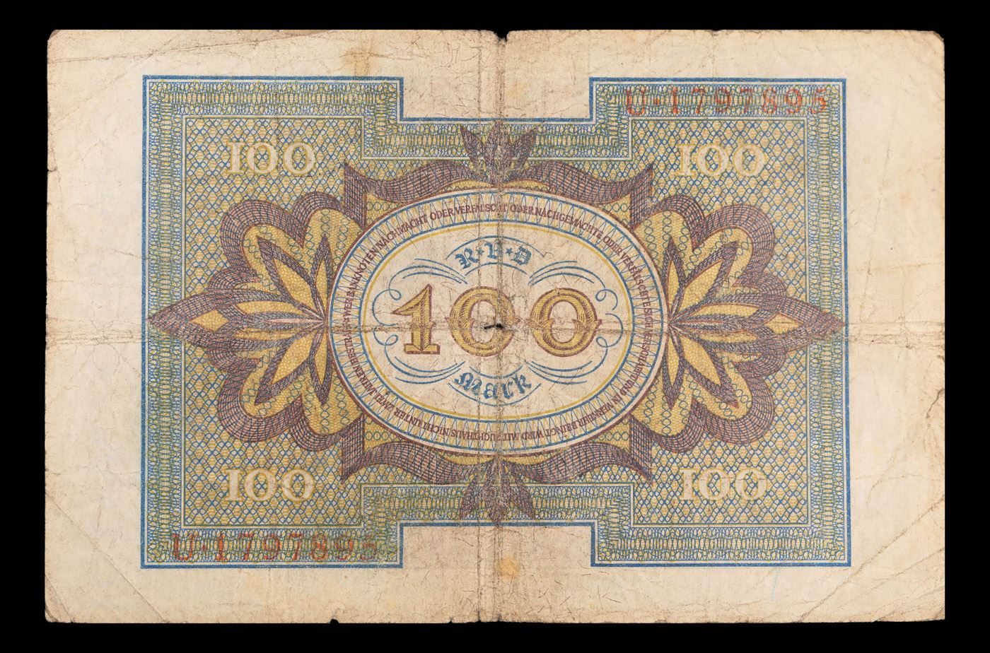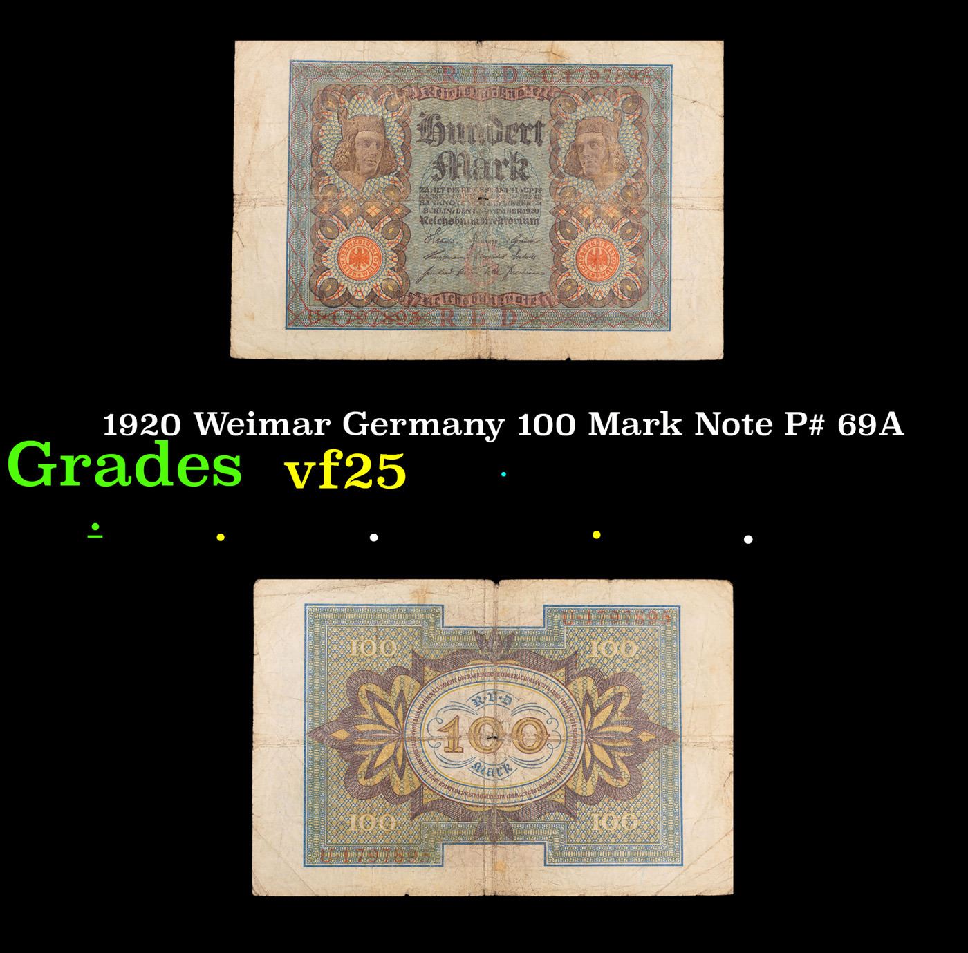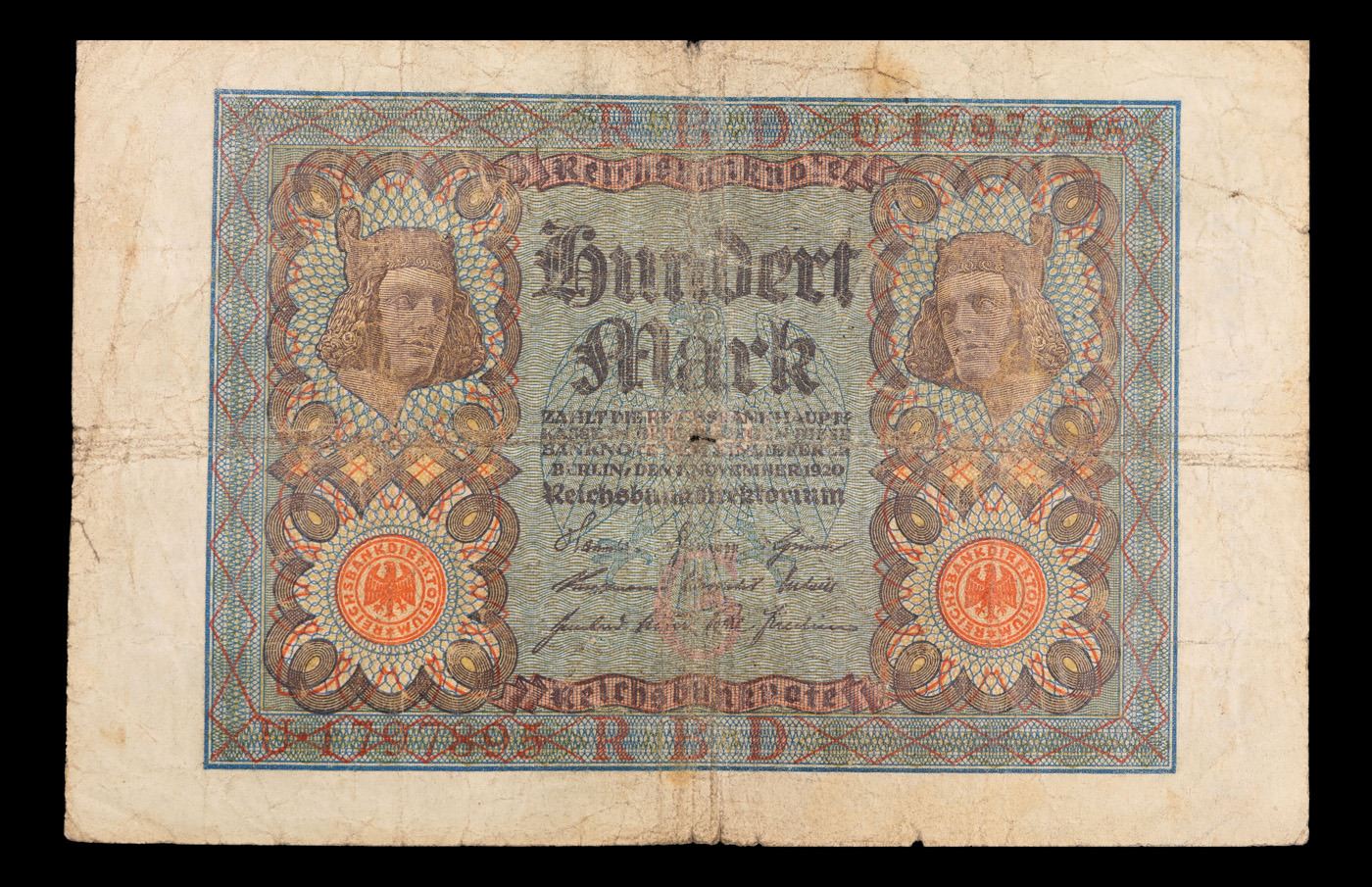 1920 Weimar Germany 100 Mark Note P# 69A Grades vf+. In the early 1920s, post-WWI Germany saw its economy spiraling out of control. Hyperinflation started directly after the war in 1918, but truly took over the Weimar Republic from 1921 to 1923. The value of the Mark declined incredibly rapidly. 1 USD was equal to 50 German Marks at the beginning of 1920. Toward the end of 1923, 1 USD was equal to over 4,200,000,000,000 German Marks. At times, denominations of the Mark became less valuable than the paper and labor to print it almost immediately after printing. Thus, denominations of the Mark notes became incredibly large, ending up in the tens of trillions.