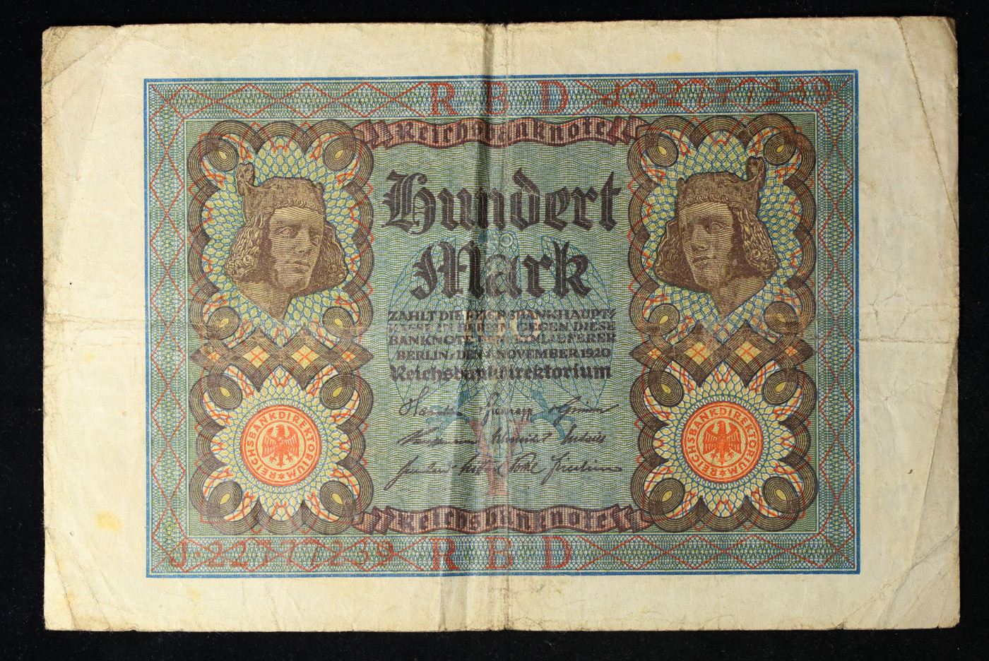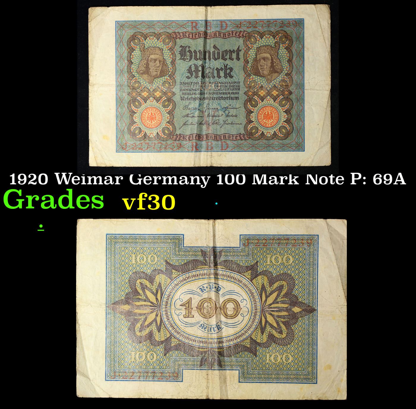 1920 Weimar Germany 100 Mark Note P: 69A Grades vf++. Notgeld is German for "emergency/necessity money". Notgeld typically refers to German and Austrian notes produced in the post-WWI period. Somewhat similar to Depression Scrip in the USA, these notes were issued when there wasn'te nough state-produced money available from the central bank. Issuing institutions were often a town's savings banks, municipalities, or private or state-owned firms. Nearly all issues contained an expiry date, after which time they were invalid. Issues without dates ordinarily had an expiry announced in a newspaper or at the place of issuance.