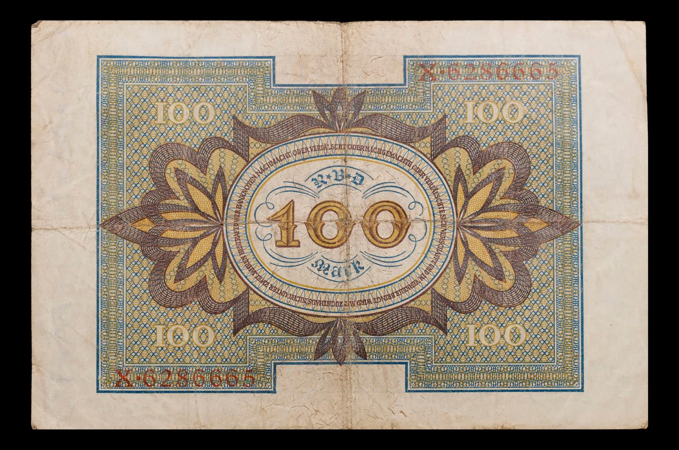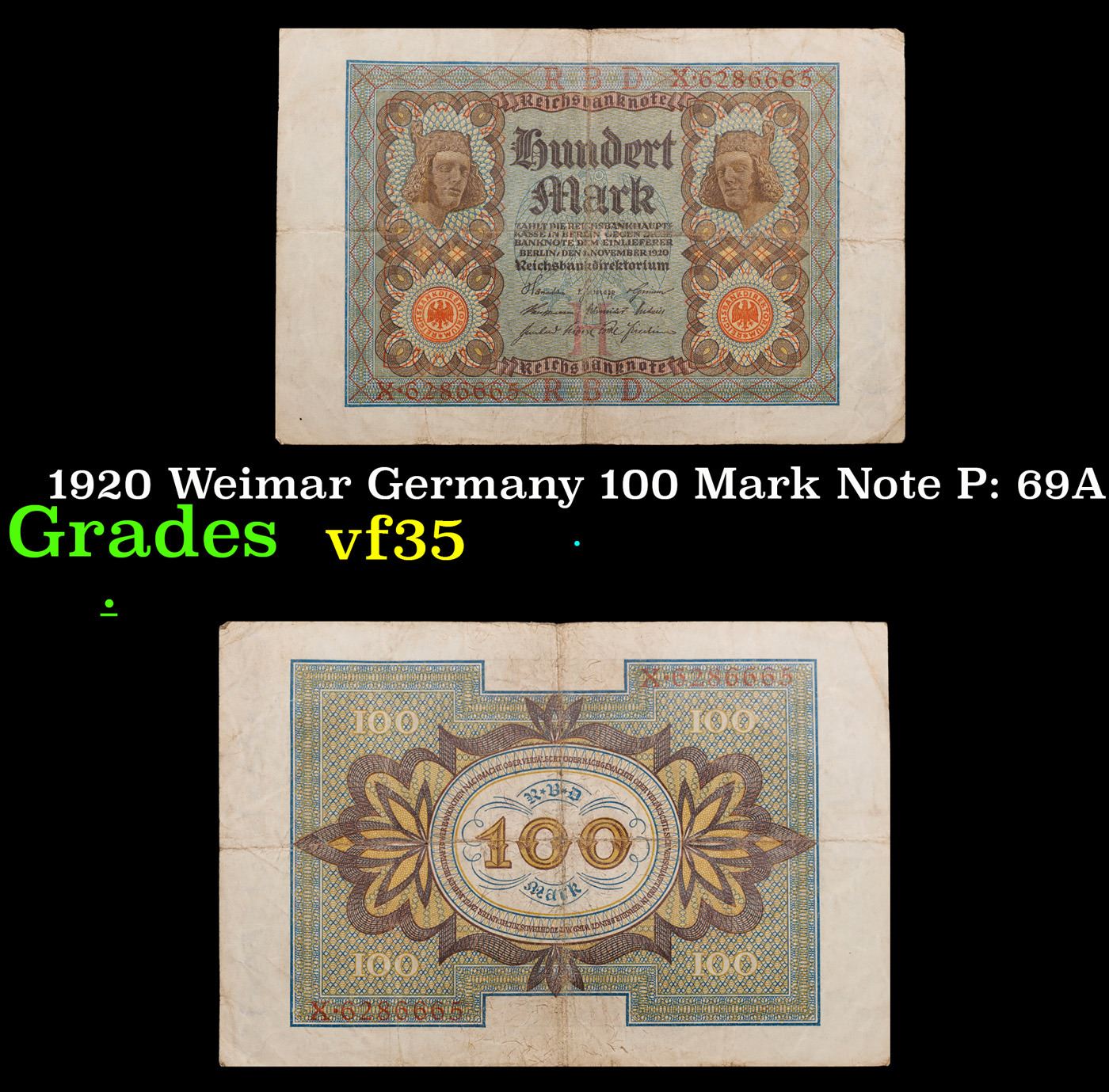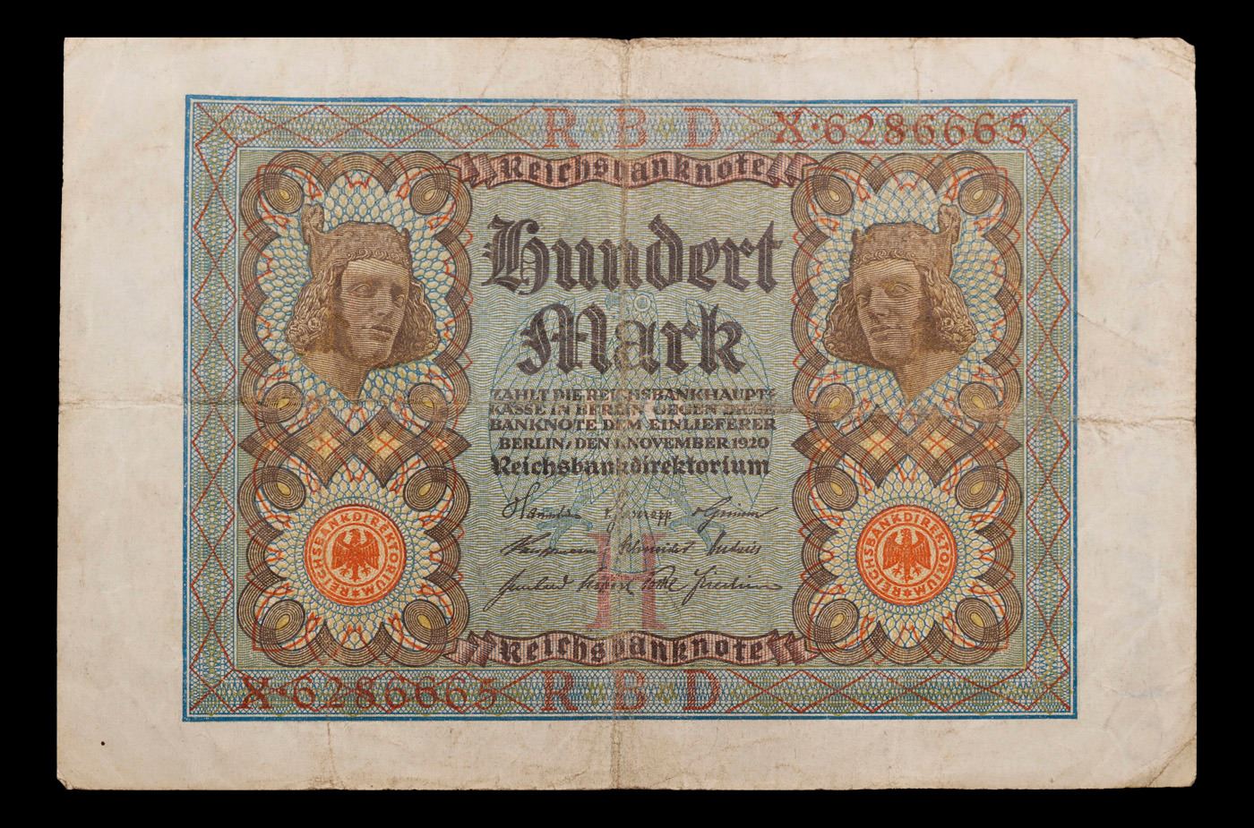 1920 Weimar Germany 100 Mark Note P: 69A Grades vf++. In the early 1920s, post-WWI Germany saw its economy spiraling out of control. Hyperinflation started directly after the war in 1918, but truly took over the Weimar Republic from 1921 to 1923. The value of the Mark declined incredibly rapidly. 1 USD was equal to 50 German Marks at the beginning of 1920. Toward the end of 1923, 1 USD was equal to over 4,200,000,000,000 German Marks. At times, denominations of the Mark became less valuable than the paper and labor to print it almost immediately after printing. Thus, denominations of the Mark notes became incredibly large, ending up in the tens of trillions.