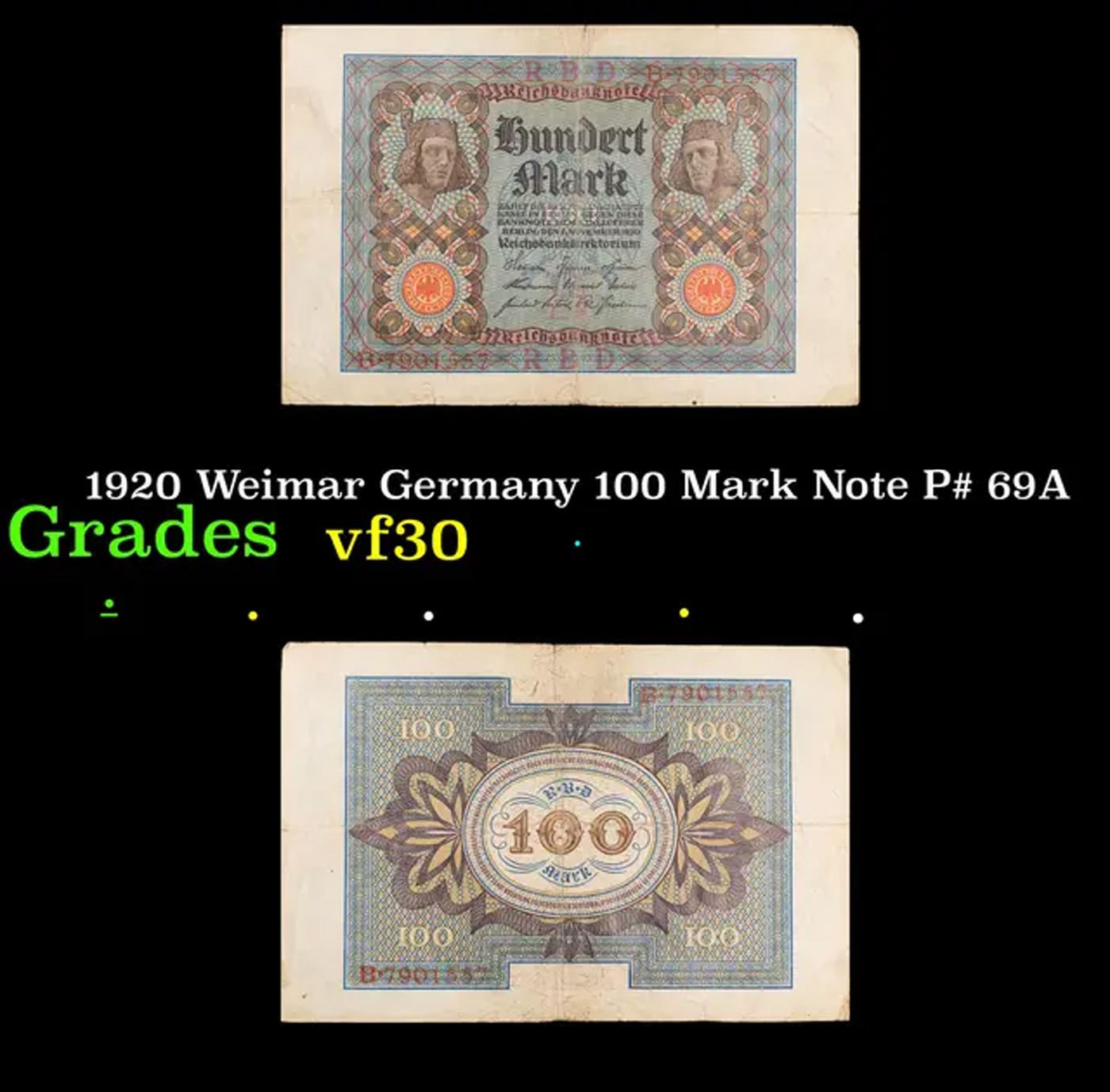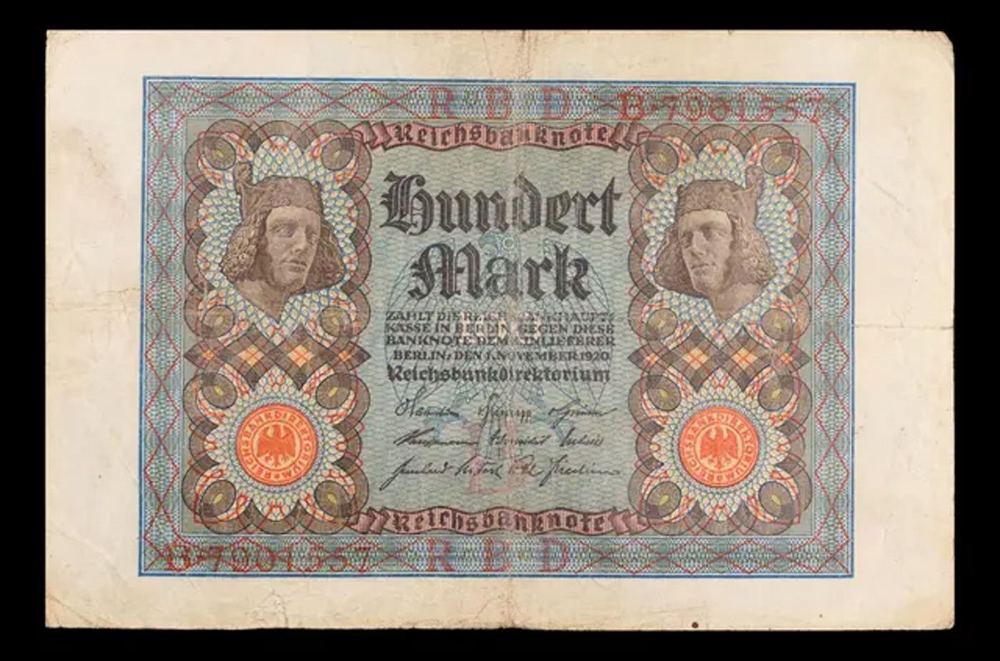 1920 Weimar Germany 100 Mark Note P# 69A Grades vf++. In the early 1920s, post-WWI Germany saw its economy spiraling out of control. Hyperinflation started directly after the war in 1918, but truly took over the Weimar Republic from 1921 to 1923. The value of the Mark declined incredibly rapidly. 1 USD was equal to 50 German Marks at the beginning of 1920. Toward the end of 1923, 1 USD was equal to over 4,200,000,000,000 German Marks. At times, denominations of the Mark became less valuable than the paper and labor to print it almost immediately after printing. Thus, denominations of the Mark notes became incredibly large, ending up in the tens of trillions.