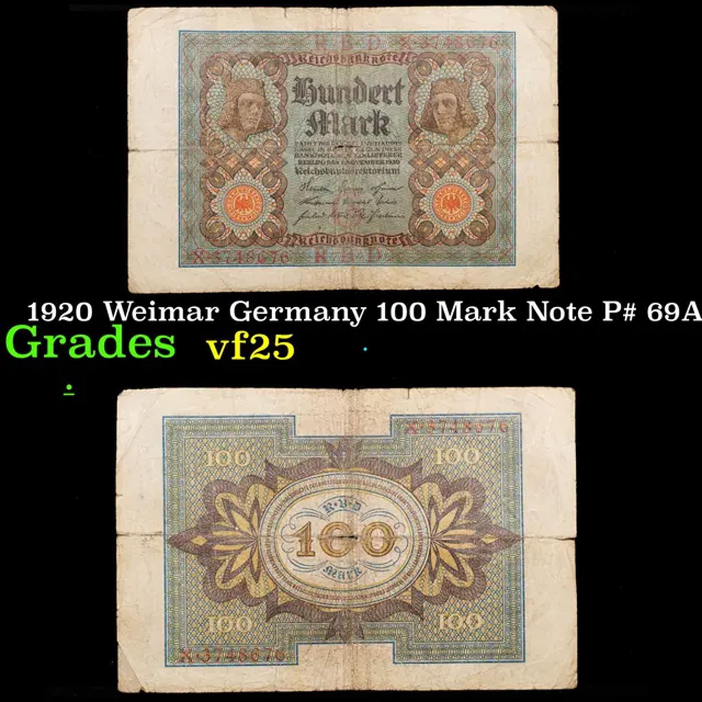 1920 Weimar Germany 100 Mark Note P# 69A Grades vf+. Notgeld is German for "emergency/necessity money". Notgeld typically refers to German and Austrian notes produced in the post-WWI period. Somewhat similar to Depression Scrip in the USA, these notes were issued when there wasn'te nough state-produced money available from the central bank. Issuing institutions were often a town's savings banks, municipalities, or private or state-owned firms. Nearly all issues contained an expiry date, after which time they were invalid. Issues without dates ordinarily had an expiry announced in a newspaper or at the place of issuance.