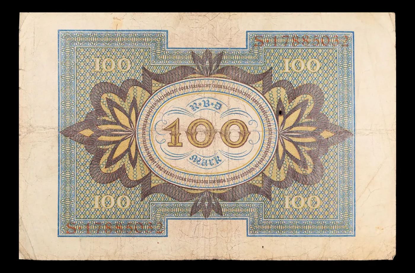 1920 Weimar Germany 100 Mark Note P# 69A Grades vf+. In the early 1920s, post-WWI Germany saw its economy spiraling out of control. Hyperinflation started directly after the war in 1918, but truly took over the Weimar Republic from 1921 to 1923. The value of the Mark declined incredibly rapidly. 1 USD was equal to 50 German Marks at the beginning of 1920. Toward the end of 1923, 1 USD was equal to over 4,200,000,000,000 German Marks. At times, denominations of the Mark became less valuable than the paper and labor to print it almost immediately after printing. Thus, denominations of the Mark notes became incredibly large, ending up in the tens of trillions.