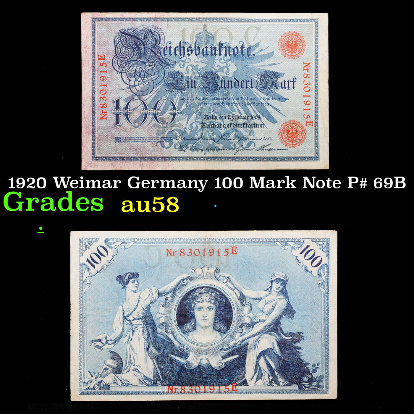 1920 Weimar Germany 100 Mark Note P# 69B Grades Choice AU/BU Slider.