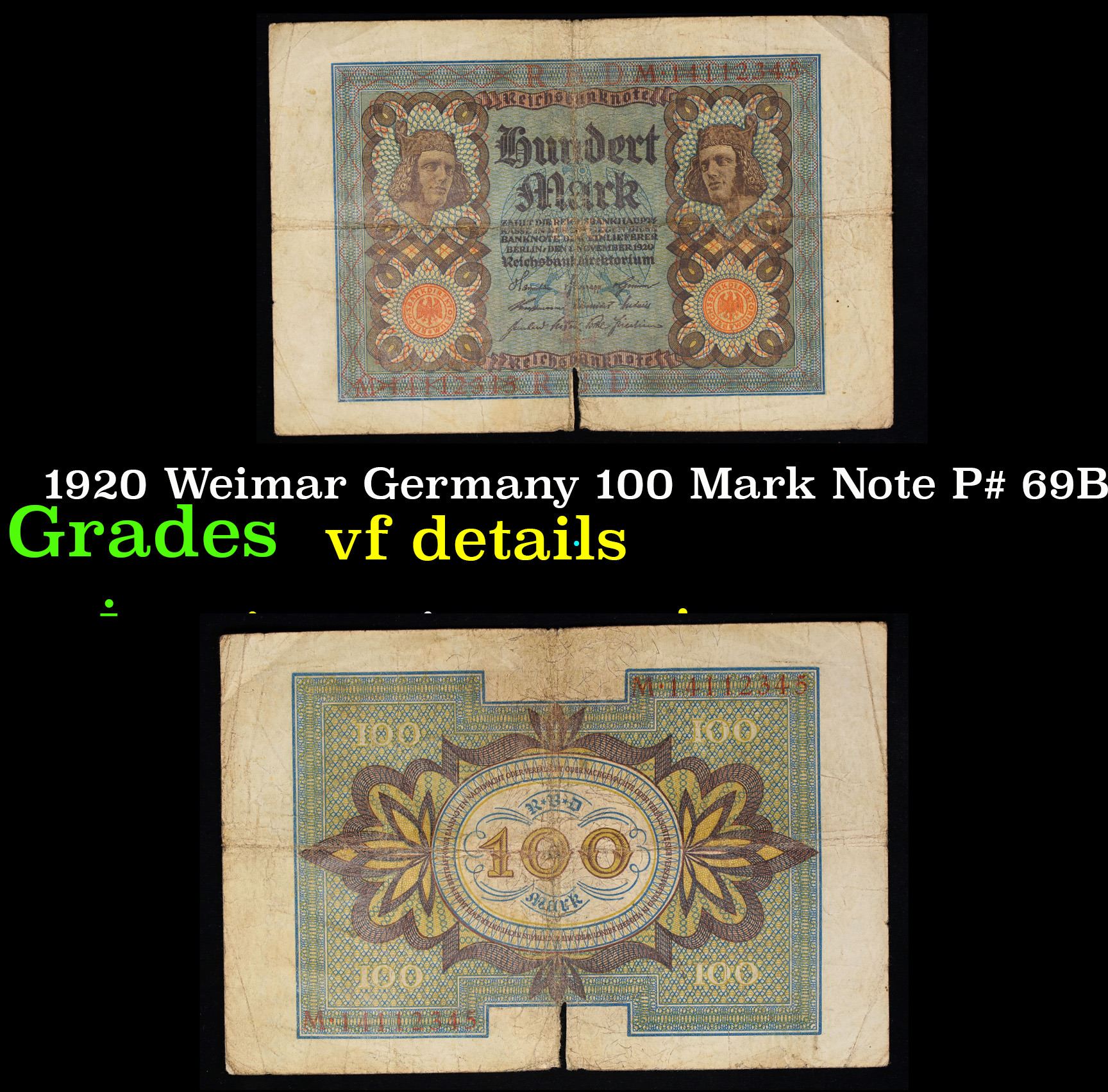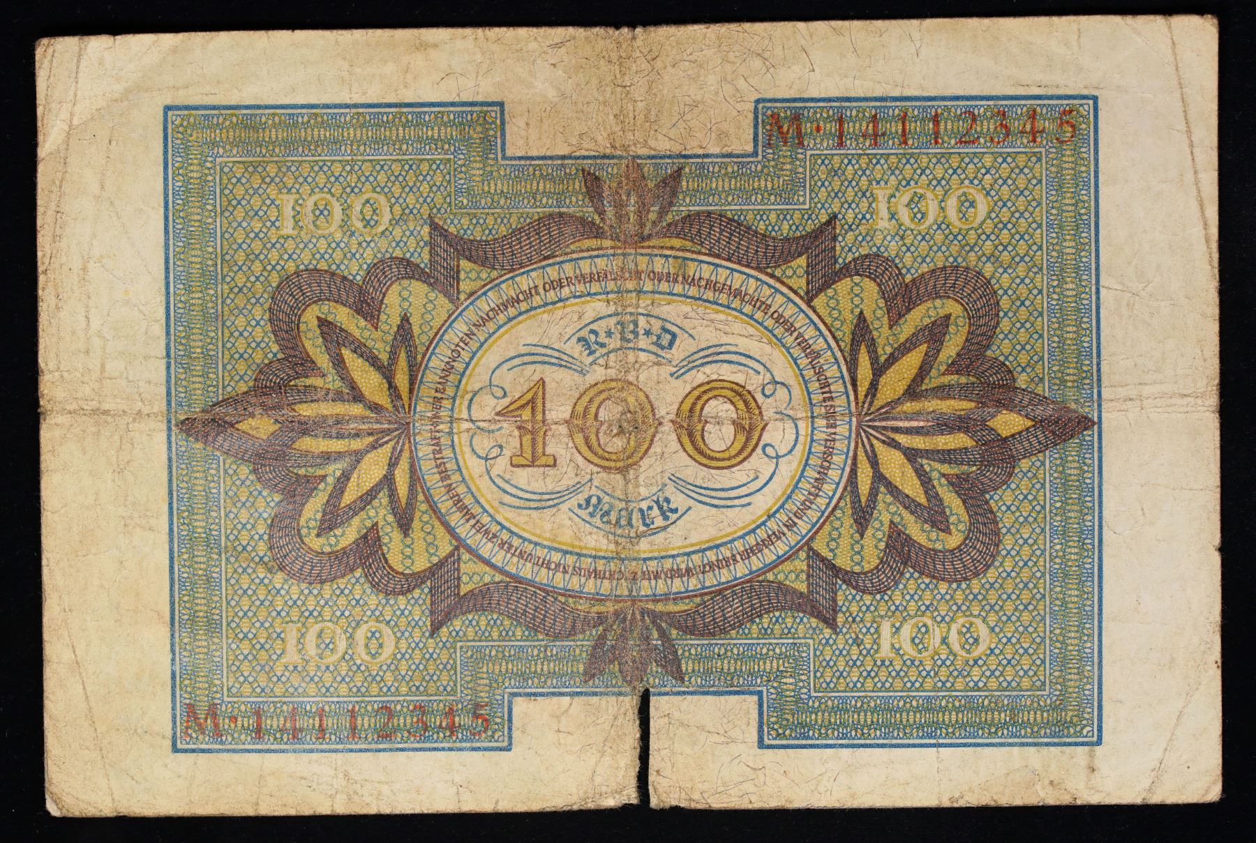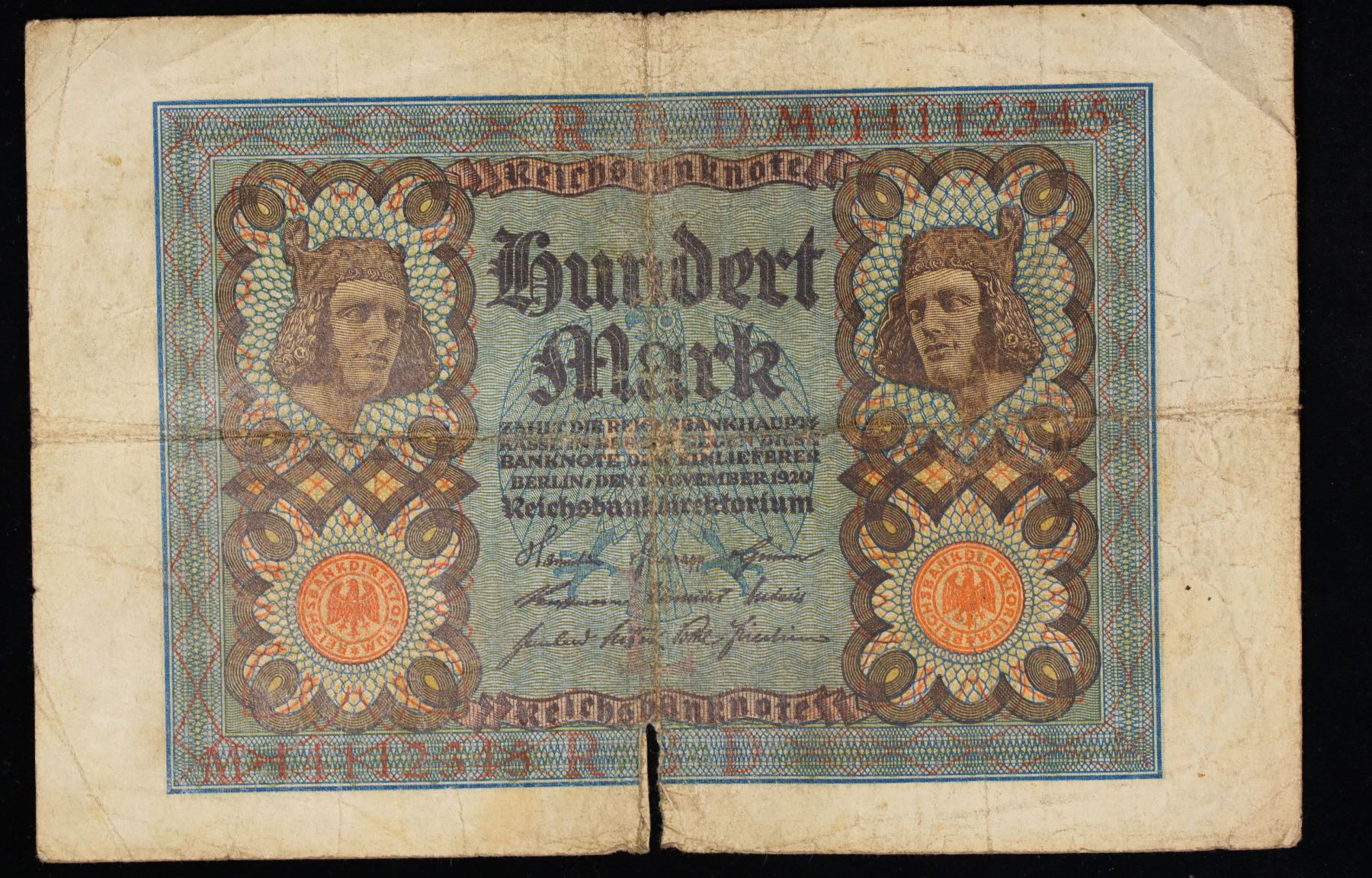 1920 Weimar Germany 100 Mark Note P# 69B Grades vf details. In the early 1920s, post-WWI Germany saw its economy spiraling out of control. Hyperinflation started directly after the war in 1918, but truly took over the Weimar Republic from 1921 to 1923. The value of the Mark declined incredibly rapidly. 1 USD was equal to 50 German Marks at the beginning of 1920. Toward the end of 1923, 1 USD was equal to over 4,200,000,000,000 German Marks. At times, denominations of the Mark became less valuable than the paper and labor to print it almost immediately after printing. Thus, denominations of the Mark notes became incredibly large, ending up in the tens of trillions.