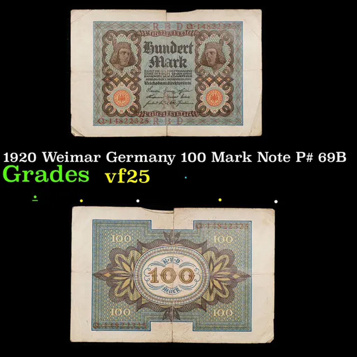 1920 Weimar Germany 100 Mark Note P# 69B Grades vf+.