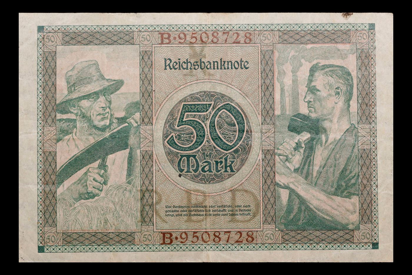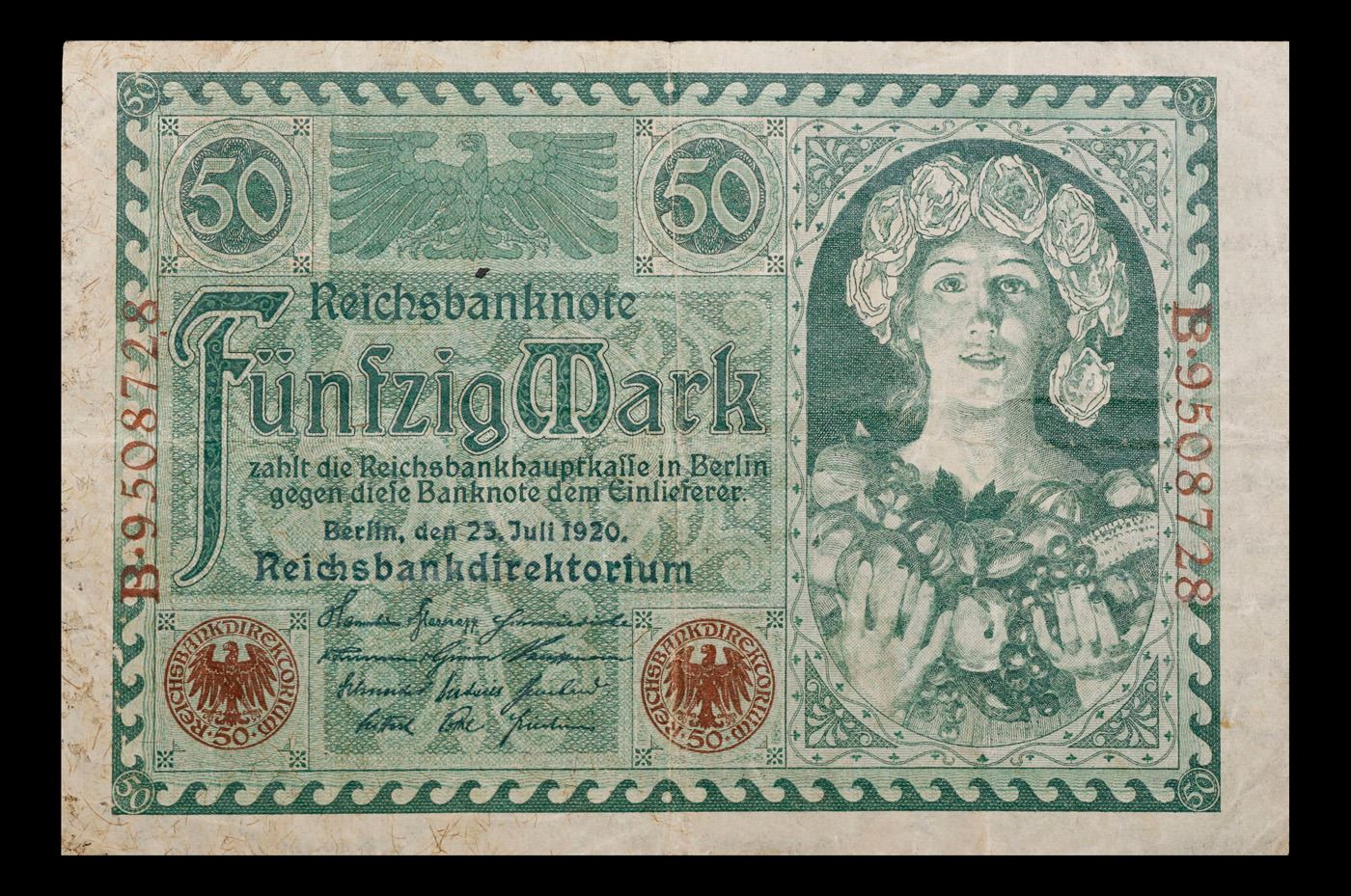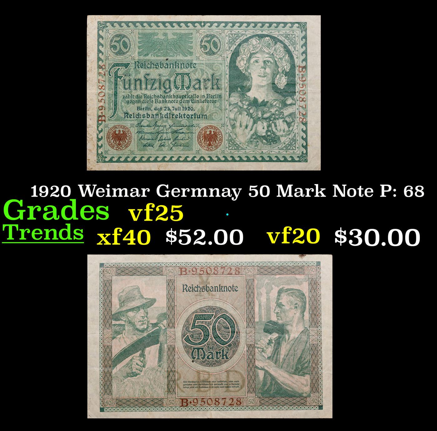 1920 Weimar Germnay 50 Mark Note P: 68 Grades vf+. In the early 1920s, post-WWI Germany saw its economy spiraling out of control. Hyperinflation started directly after the war in 1918, but truly took over the Weimar Republic from 1921 to 1923. The value of the Mark declined incredibly rapidly. 1 USD was equal to 50 German Marks at the beginning of 1920. Toward the end of 1923, 1 USD was equal to over 4,200,000,000,000 German Marks. At times, denominations of the Mark became less valuable than the paper and labor to print it almost immediately after printing. Thus, denominations of the Mark notes became incredibly large, ending up in the tens of trillions.