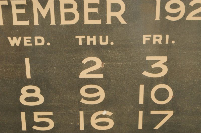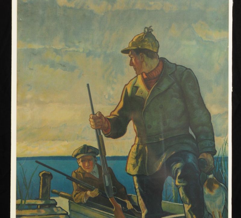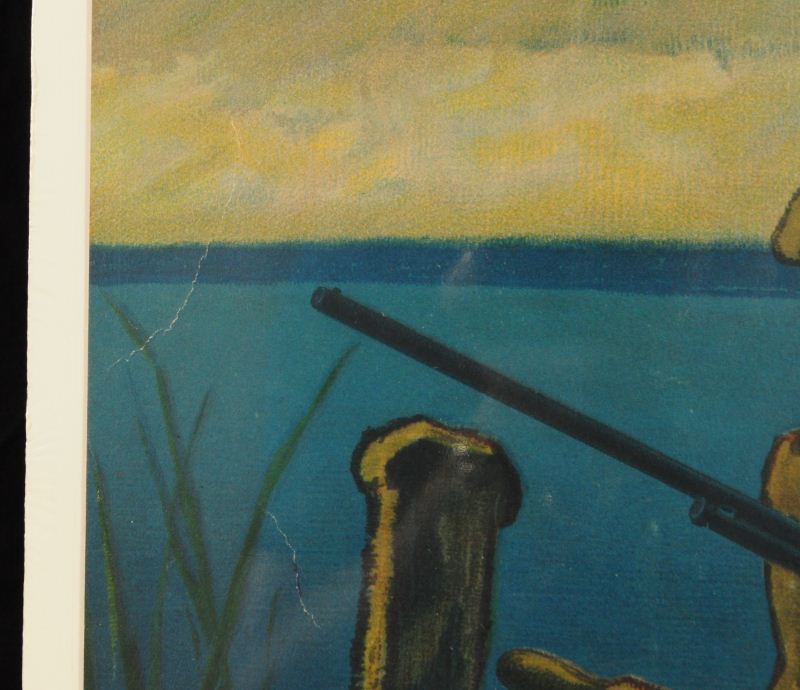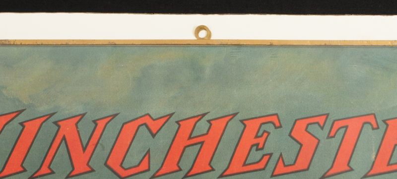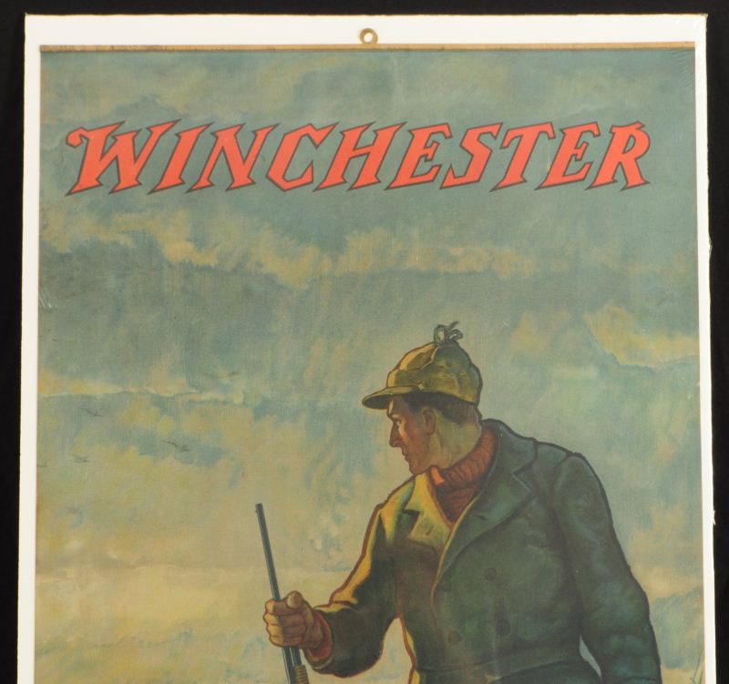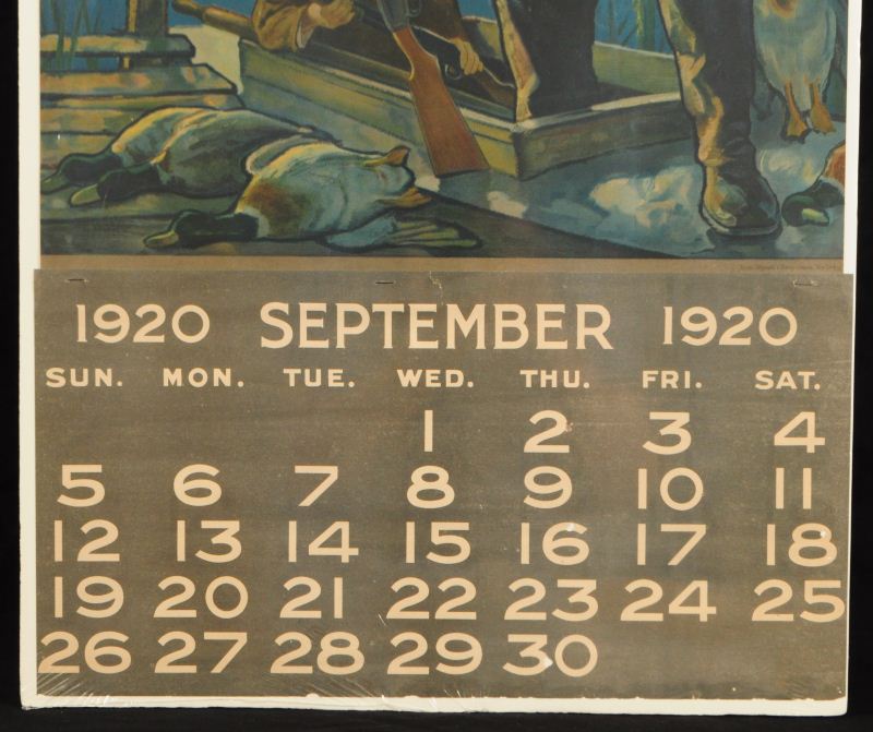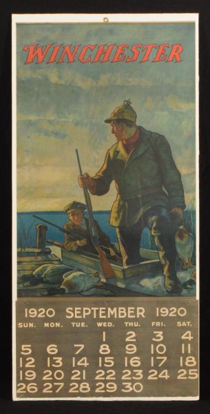 1920 Winchester Gun Advertising Calendar. With Band & hang tab. Promoting the Model 12 shotgun with father/son, duck, boat and mallard green heads. Measures 39" x 19"