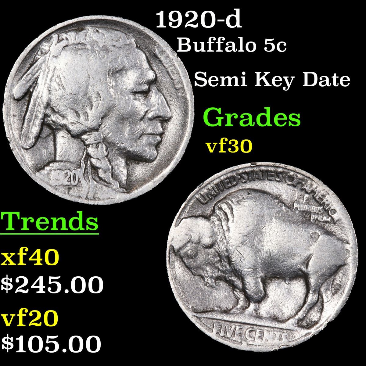 1920-d Semi Key Date . Buffalo Nickel 5c Grades vf++.