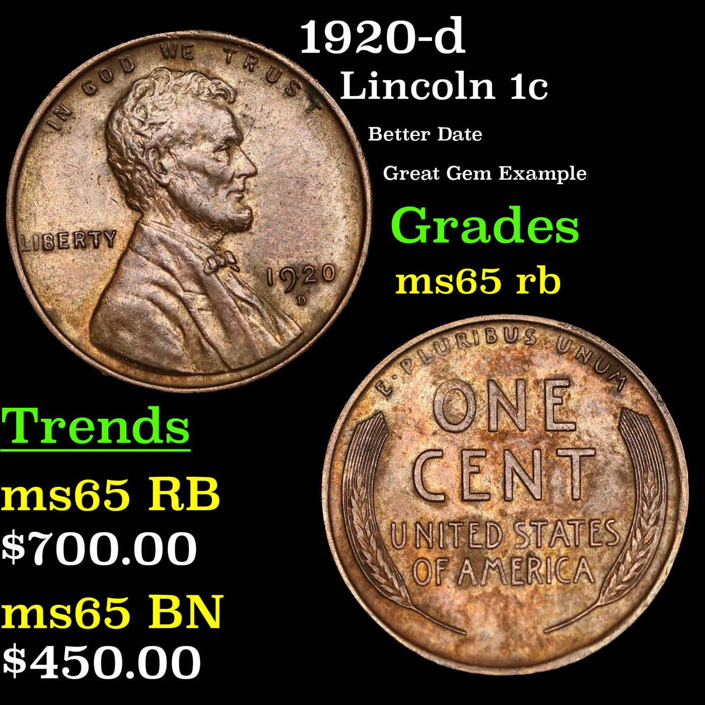 1920-d Lincoln Cent 1c Grades GEM Unc RB.
