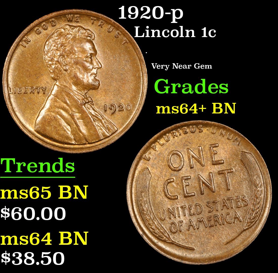 1920-p . Very Near Gem Lincoln Cent 1c Grades Choice+ Unc BN.