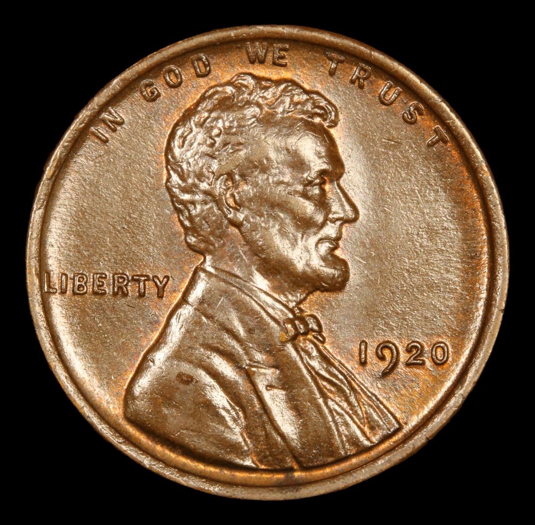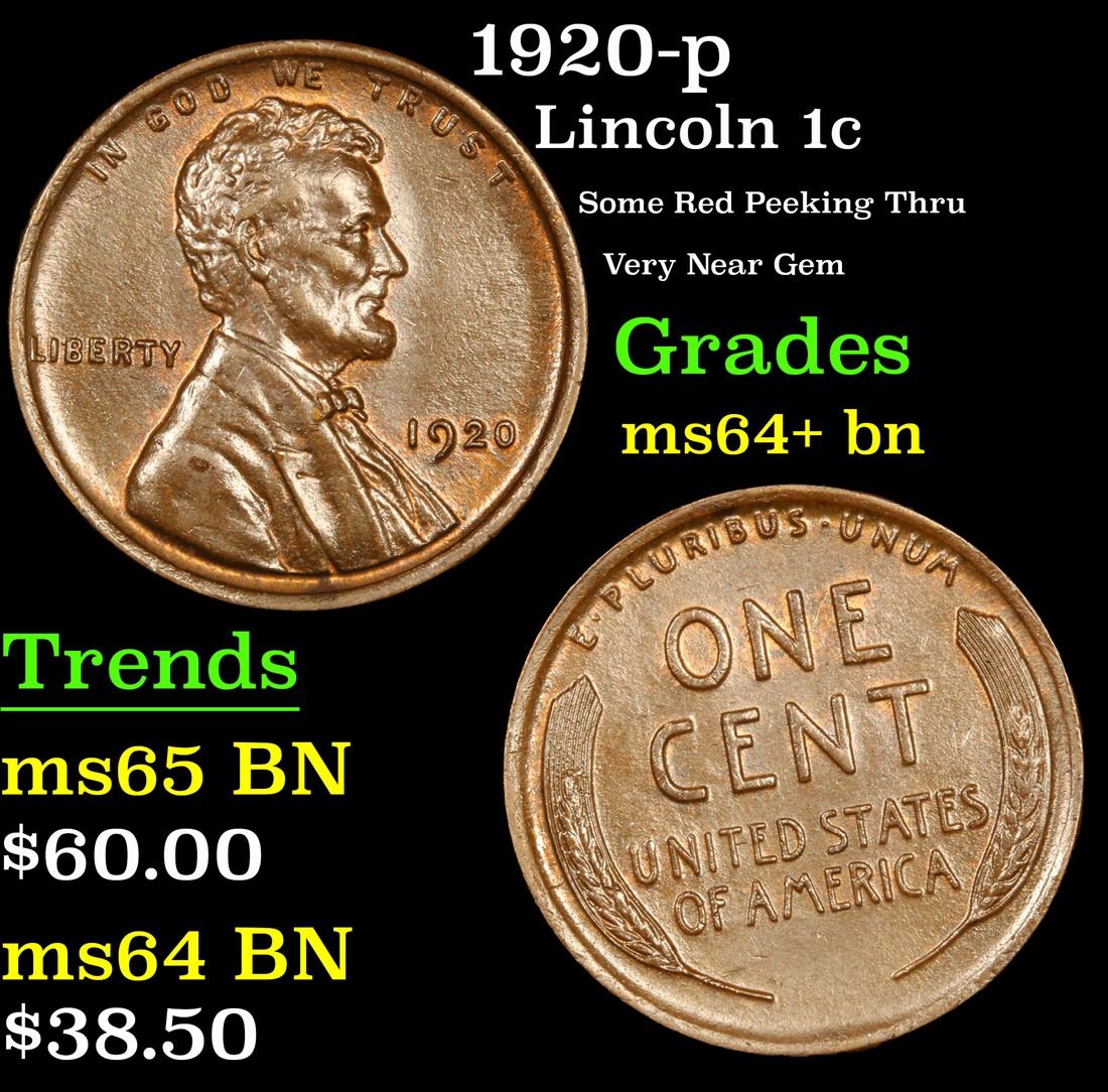 1920-p Some Red Peeking Thru Very Near Gem Lincoln Cent 1c Grades Choice+ Unc BN.