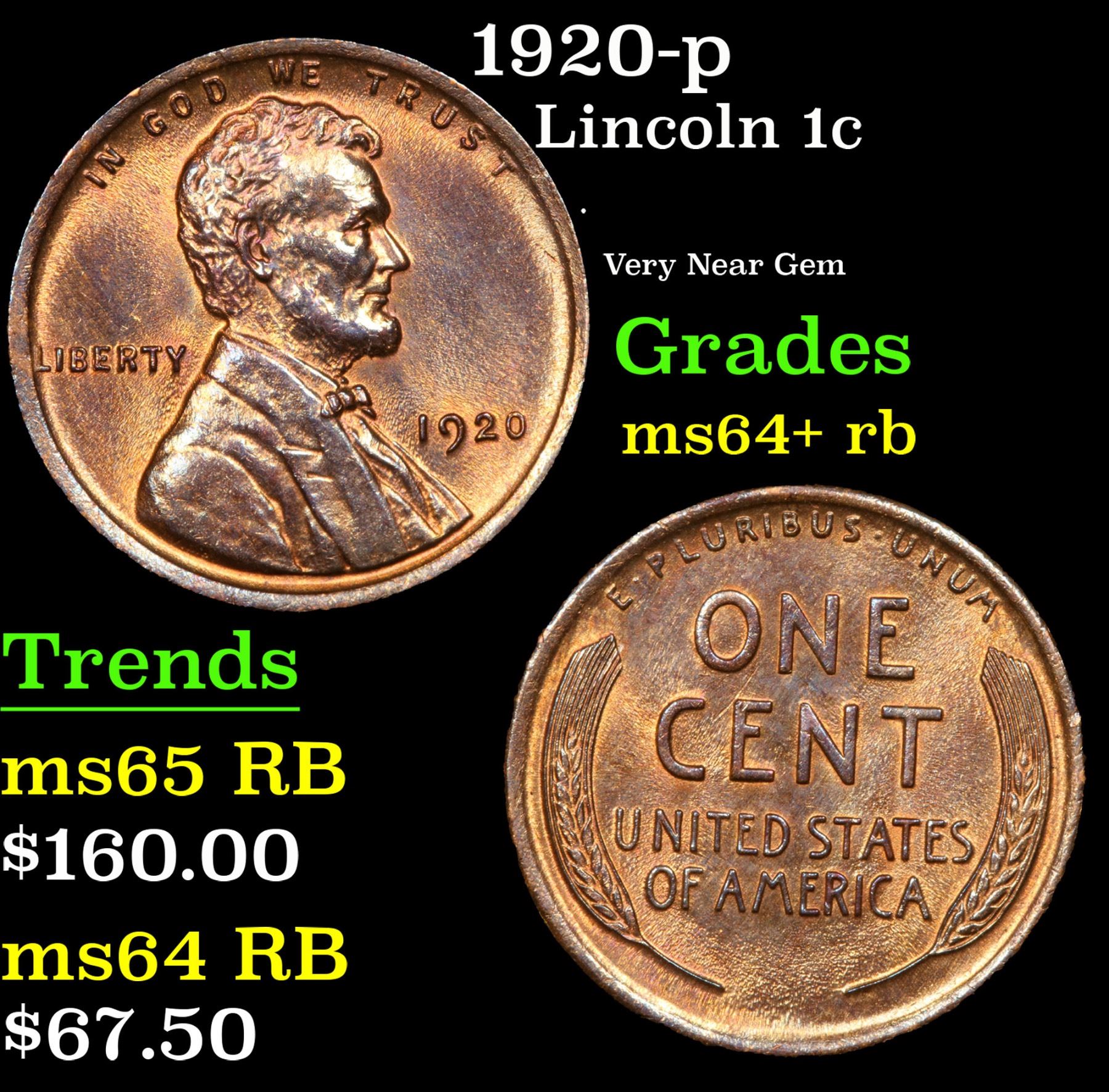 1920-p . Very Near Gem Lincoln Cent 1c Grades Choice+ Unc RB.