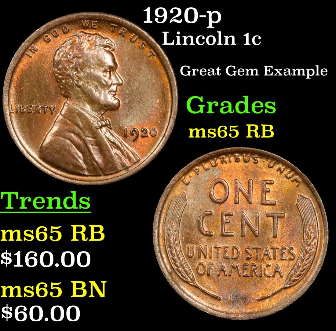 1920-p . Great Gem Example Lincoln Cent 1c Grades GEM Unc RB.