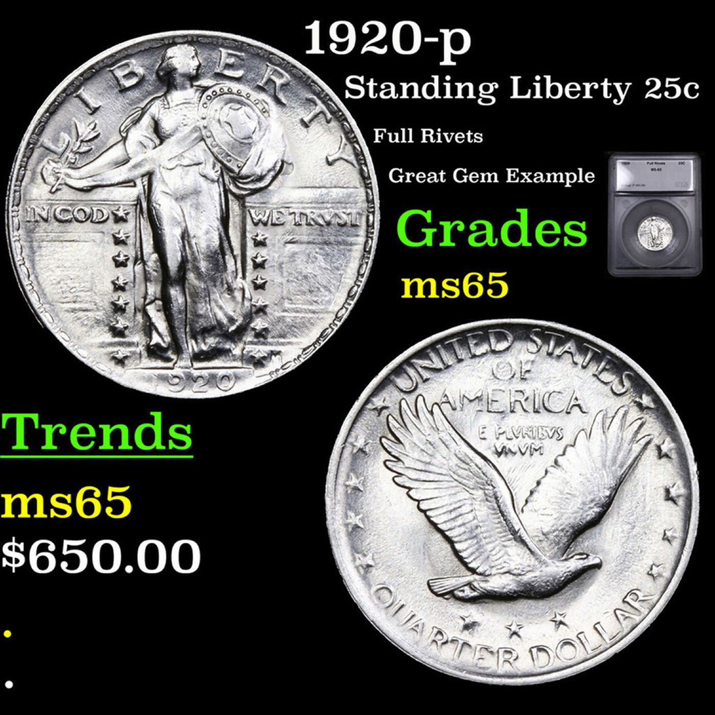 1920-p Standing Liberty Quarter 25c Graded ms65 BY SEGS.