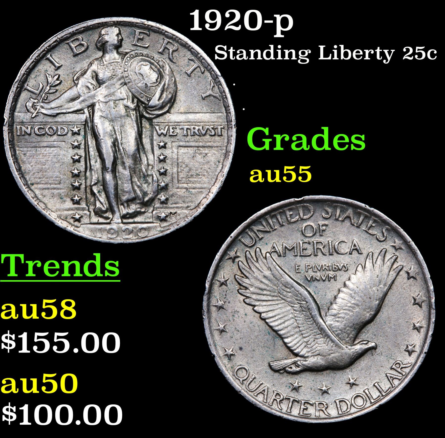 1920-p Standing Liberty Quarter 25c Grades Choice AU.