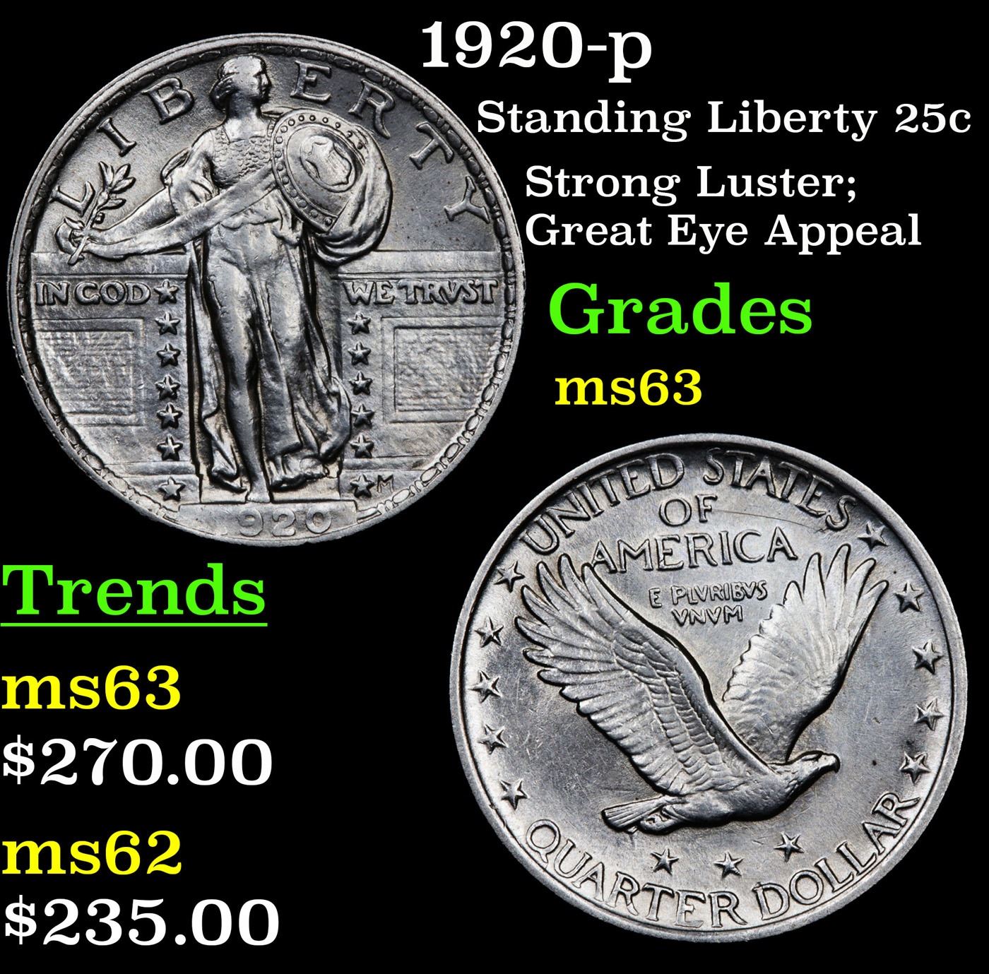 1920-p Standing Liberty Quarter 25c Grades Select Unc.
